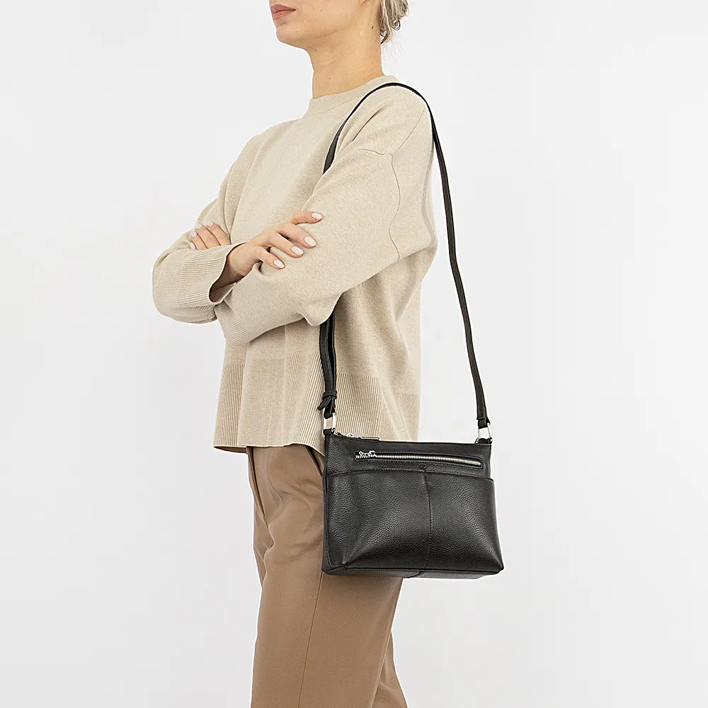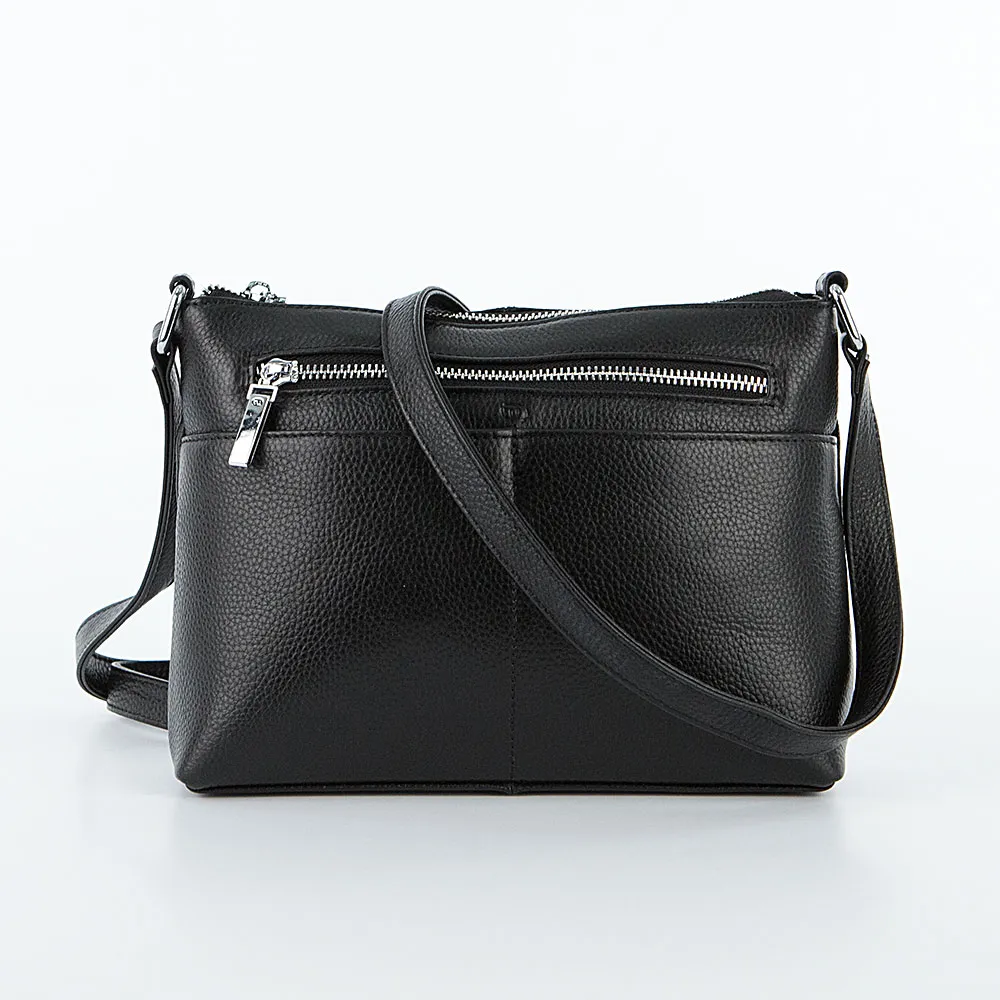 Сумка от торговой марки Francesco Molinary из натуральной кожи черного цвета. Компактная модель с несъемным регулируемым плечевым ремнем. Отделение на молнии. Внутри: фирменная подкладка, средник и карман на молнии, два накладных кармана. На лицевой стороне – карман на молнии, два накладных кармана на кнопке. На задней стороне – карман на молнии.