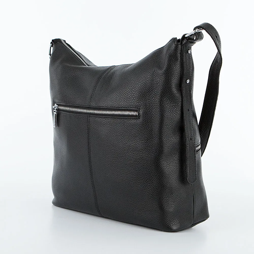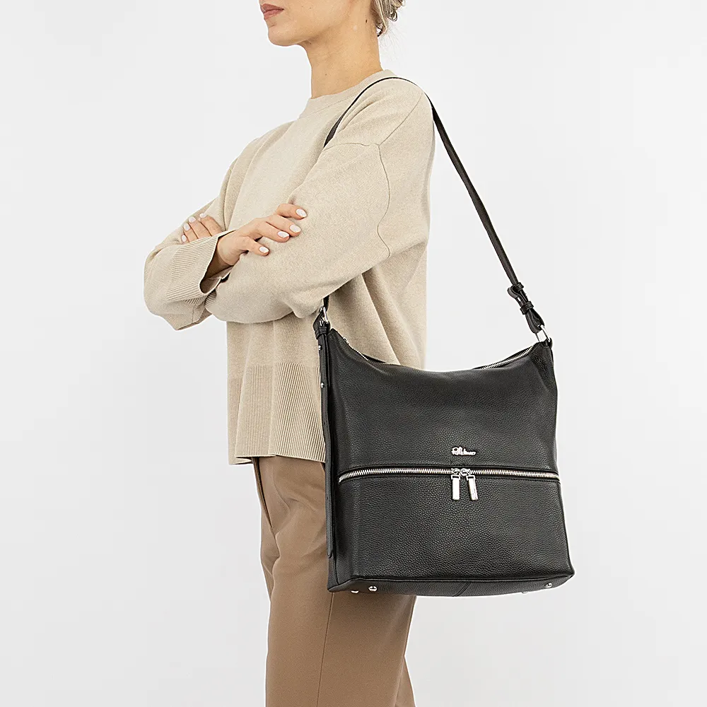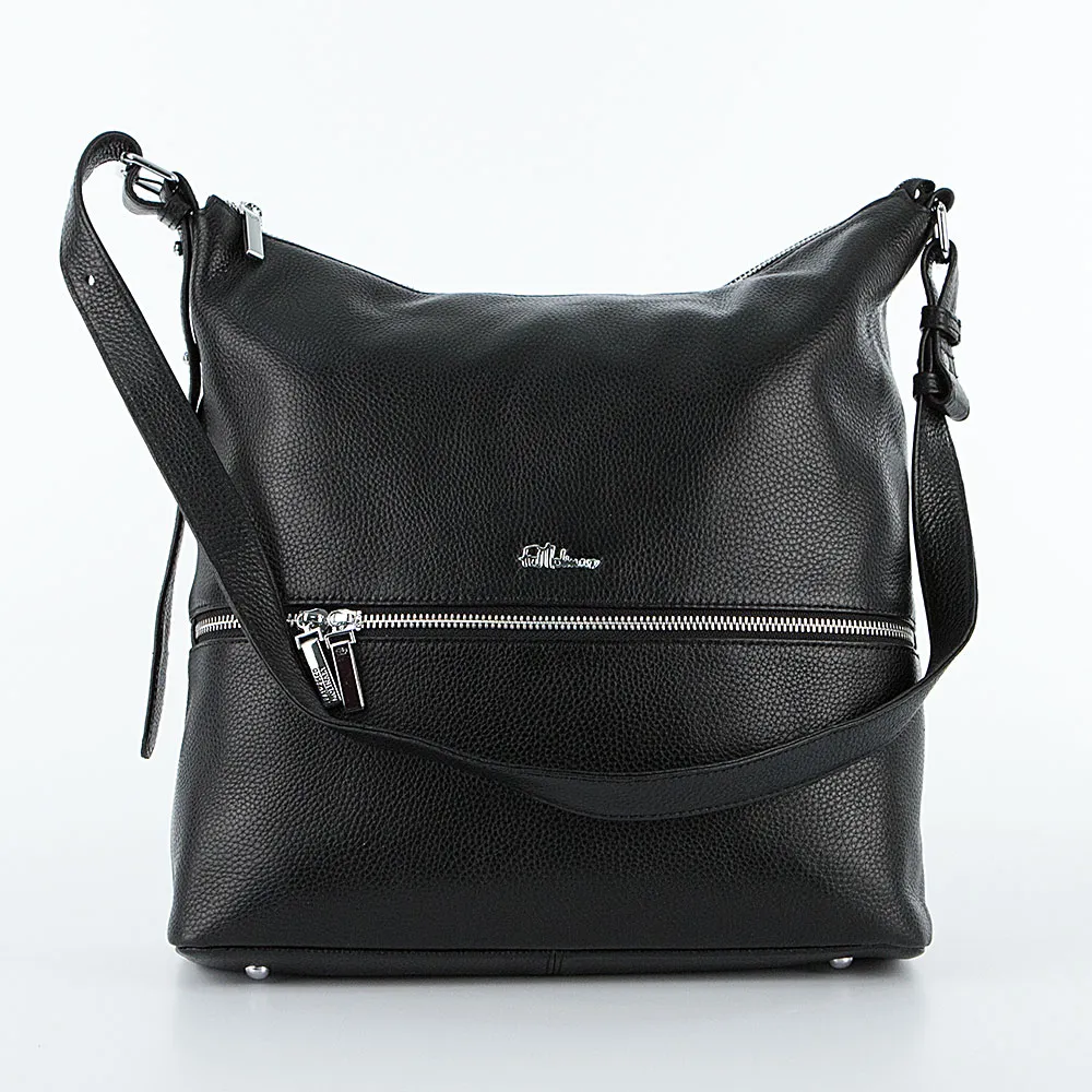 Сумка от торговой марки Francesco Molinary из натуральной кожи черного цвета. Модель с несъемным регулируемым плечевым ремнем с кобурными кнопками. Отделение на молнии. Внутри: фирменная подкладка, средник и карман на молнии, два накладных кармана. На лицевой и задней сторонах – карман на молнии. Дно сумки оснащено металлическими ножками от износа.