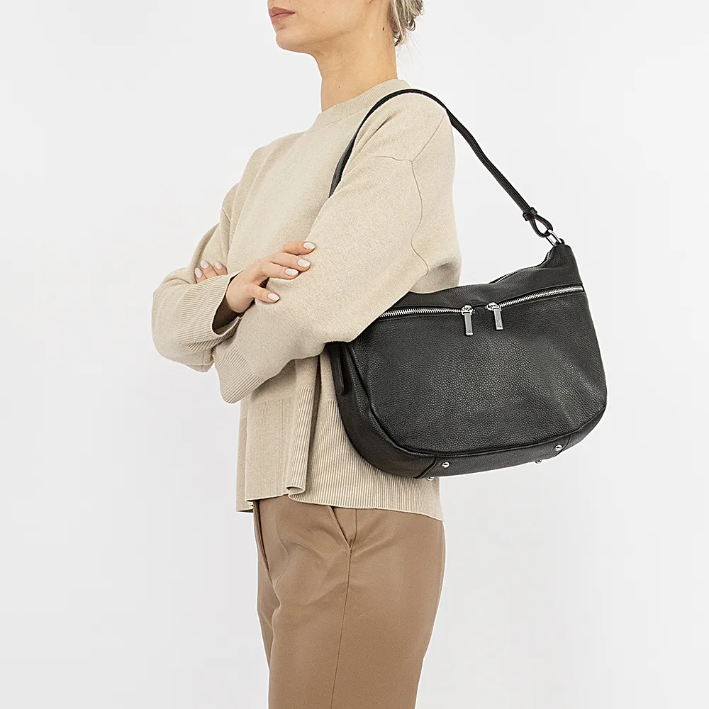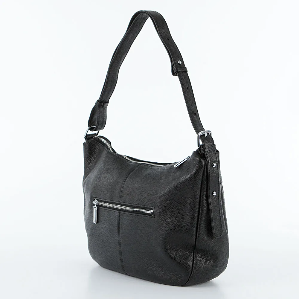 Сумка от торговой марки Francesco Molinary из натуральной кожи черного цвета. Модель с несъемным регулируемым плечевым ремнем. Отделение на молнии. Внутри: фирменная подкладка, средник и карман на молнии, два накладных кармана. На лицевой стороне – два кармана на молнии. На задней стороне – карман на молнии. Дно сумки оснащено металлическими ножками от износа.