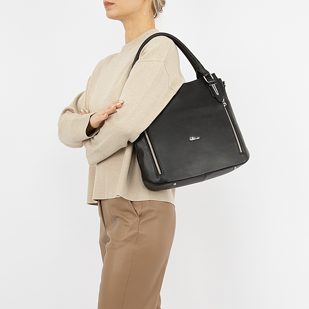Сумка от торговой марки Francesco Molinary из натуральной кожи черного цвета. Модель с двумя ручками и съемным регулируемым плечевым ремнем. Отделение на молнии. Внутри: фирменная подкладка, средник и карман на молнии, два накладных кармана. На лицевой стороне – два вертикальных кармана на молнии. На задней стороне – карман на молнии. Дно сумки оснащено металлическими ножками от износа.