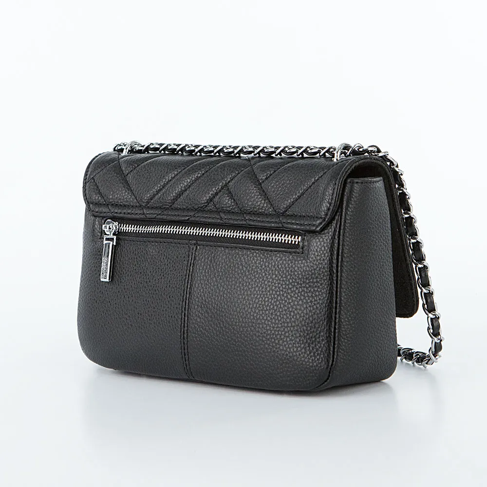 Сумка от торговой марки Francesco Molinary из натуральной кожи черного цвета с декоративной стежкой. Модель с ручкой-цепочкой. Закрывается клапаном на цупферном замке. В отделении: фирменная подкладка, средник и карман на молнии, накладной карман. На задней стороне – карман на молнии. Дно сумки оснащено металлическими ножками от износа.