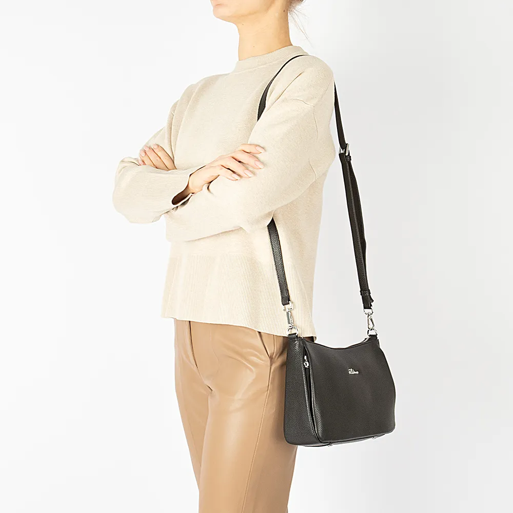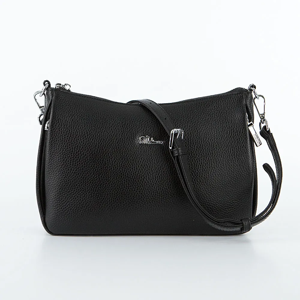 Сумка от торговой марки Francesco Molinary из натуральной кожи черного цвета. Модель со съемной ручкой и съемным регулируемым плечевым ремнем. Отделение на молнии. Внутри: фирменная подкладка, средник и карман на молнии, накладной карман. На лицевой стороне – два кармана на молнии. На задней стороне – карман на молнии. Дно сумки оснащено металлическими ножками для защиты от износа.