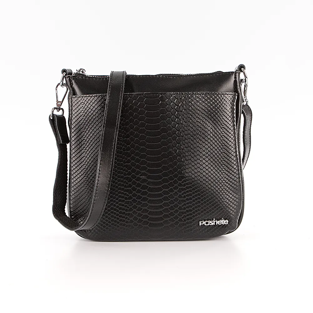 Сумка от торговой марки Poshete из натуральной кожи черного цвета. Передний карман декорирован тиснением под крокодиловую кожу. Модель со съемной ручкой, съемным регулируемым плечевым ремнем. Отделение на молнии. Внутри: текстильная подкладка, карман на молнии, накладной карман. На лицевой и задней сторонах – карман на молнии. Вместительный задний карман широко раскрывается, обеспечивая удобный доступ.
