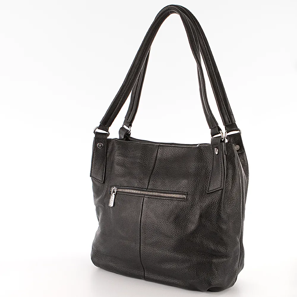 Сумка от торговой марки Poshete из натуральной кожи черного цвета. Модель с двумя удлиненными ручками. Отделение на молнии. Внутри: фирменная подкладка, средник и карман на молнии, накладной карман. На задней стороне – карман на молнии. Дно оснащено металлическими ножками для защиты от износа.