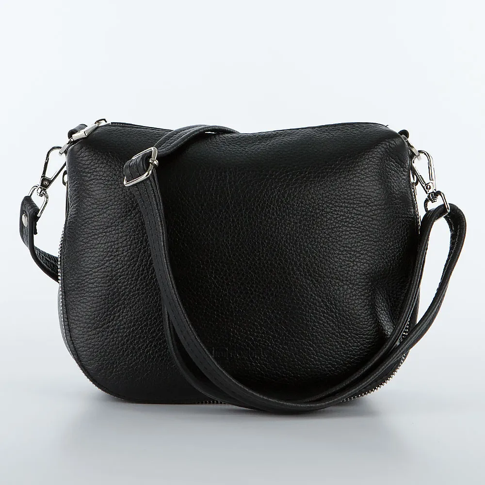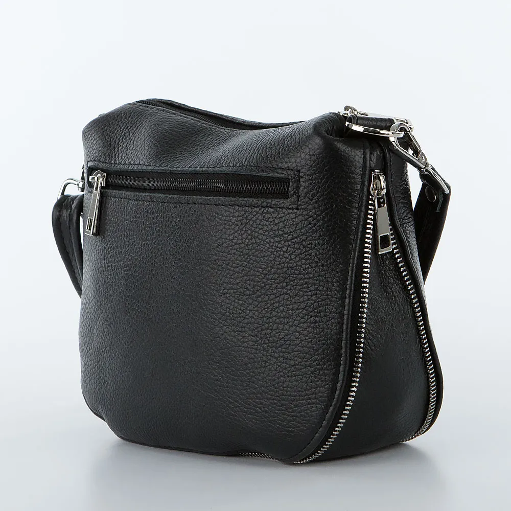Сумка от торговой марки Poshete из натуральной кожи черного цвета. Модель со съемным регулируемым плечевым ремнем. Отделение на молнии. Внутри: фирменная подкладка, карман на молнии, накладной карман. На задней стороне – карман на молнии. По нижнему краю имеется молния для увеличения объема, также выполняющая декоративную роль.