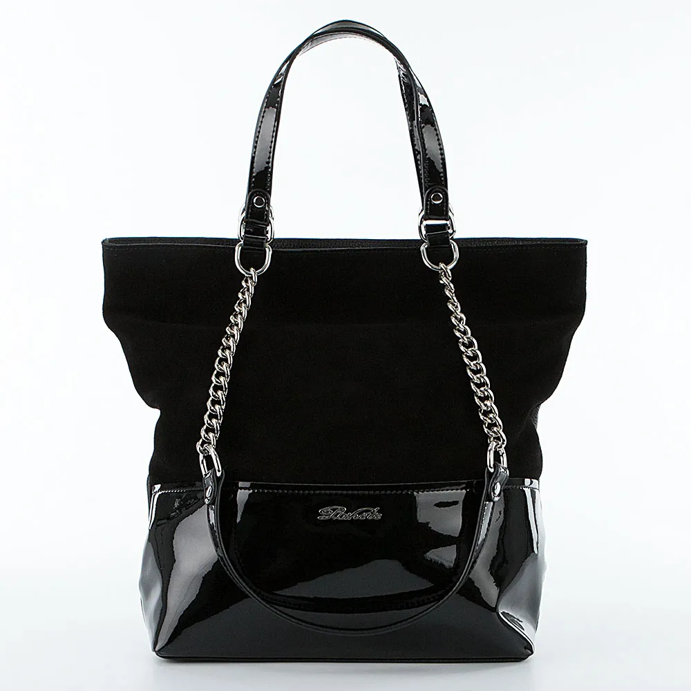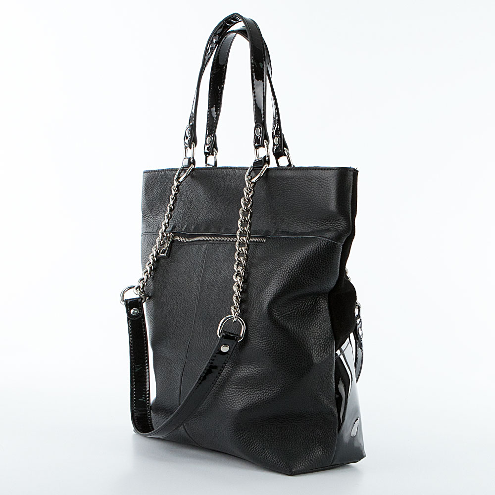 Сумка от торговой марки Poshete из натуральной кожи и замши черного цвета. Лицевая сторона декорирована лакированной и замшевой вставкой. Модель с двумя короткими лакированными ручками и двумя удлиненными ручками-цепочками. Отделение на молнии. Внутри: фирменная подкладка, средник и карман на молнии, два накладных кармана. На задней стороне – карман на молнии.