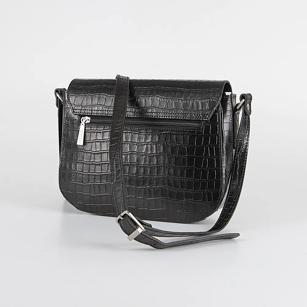 Сумка от торговой марки Francesco Molinary из натуральной кожи черного цвета с тиснением под крокодиловую кожу. Модель с несъемным регулируемым плечевым ремнем. Закрывается клапаном на магнитной кнопке. Внутри: фирменная подкладка, средник и карман на молнии. На задней стенке – карман на молнии.