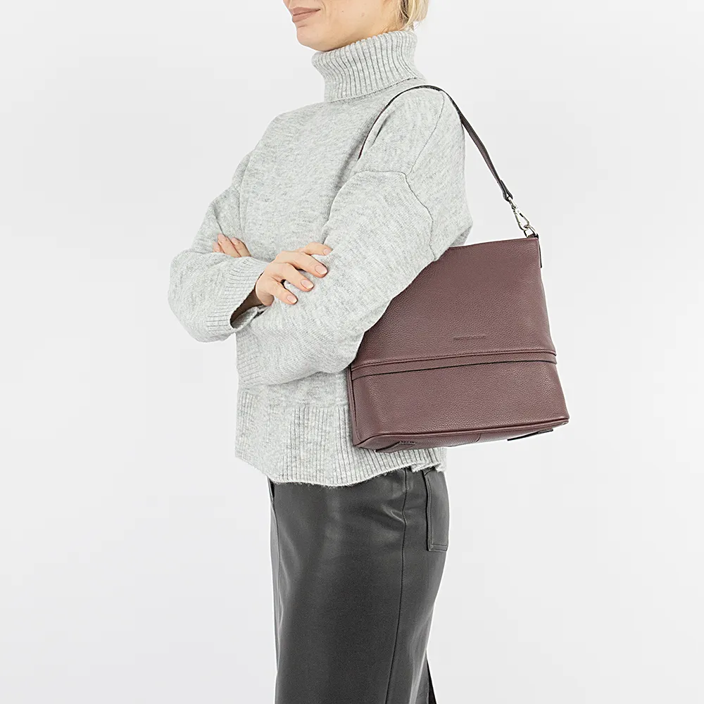 Сумка от торговой марки Francesco Molinary из натуральной кожи бордового цвета. Модель со съемной ручкой и съемным регулируемым плечевым ремнем. Отделение на молнии. Внутри: фирменная подкладка, средник и карман на молнии, накладной карман. На задней стенке – карман на молнии. На дне имеются нашивки для защиты от износа.