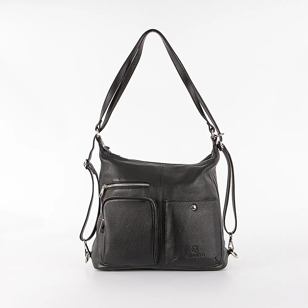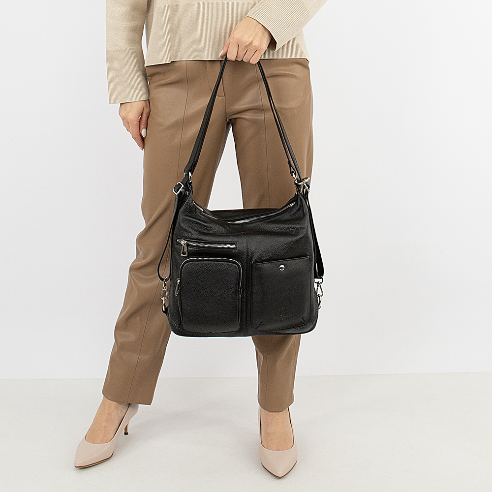 Сумка-рюкзак от торговой марки Valigetti из натуральной кожи черного цвета. Модель с одной ручкой и съемным регулируемым ремнем, выполняющим роль второй ручки и плечевых лямок. Отделение на молнии. Внутри: фирменная подкладка, средник и карман на молнии. На лицевой стороне – два кармана на молнии, накладной карман на магнитной кнопке. На задней стороне – карман на молнии. Широкое дно оснащено металлическими ножками для защиты от износа.