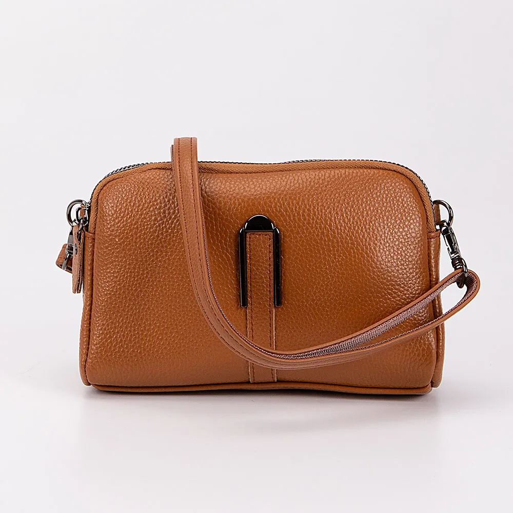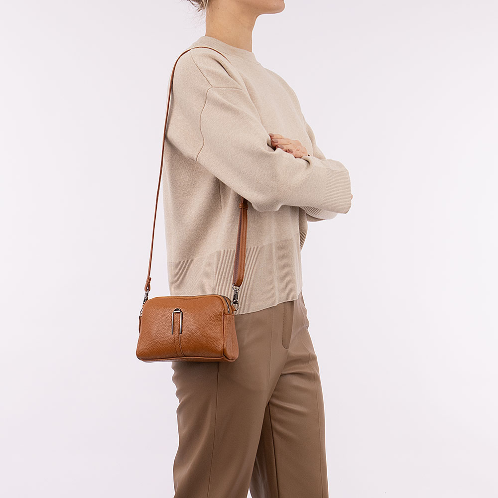 Сумка от торговой марки Poshete из натуральной кожи светло-коричневого цвета camel. Модель со съемным ремешком для запястья, съемным регулируемым плечевым ремнем. Два отделения на молнии, с текстильной подкладкой. В одном из них – карман на молнии, в другом – накладной карман. На задней стороне – карман на молнии.