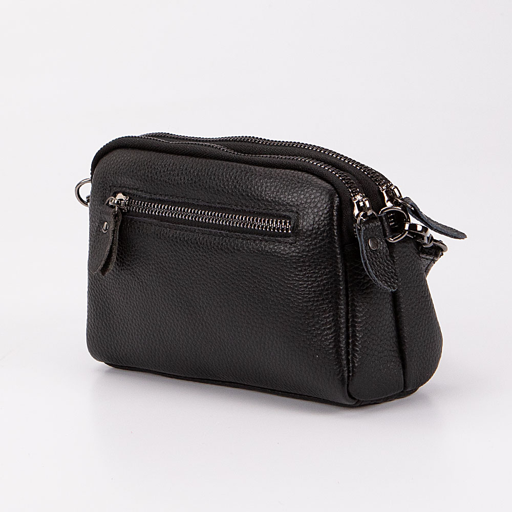 Сумка от торговой марки Poshete из натуральной кожи черного цвета. Компактная небольшая модель со съемным регулируемым плечевым ремнем и ремешком для запястья. Два отделения на молнии, с фирменной подкладкой. В заднем – карман на молнии, в переднем – накладной карман. На лицевой стороне – накладной карман с серым хлястиком на кнопке, декорированный тиснением под рептилию. На задней стороне – карман на молнии.