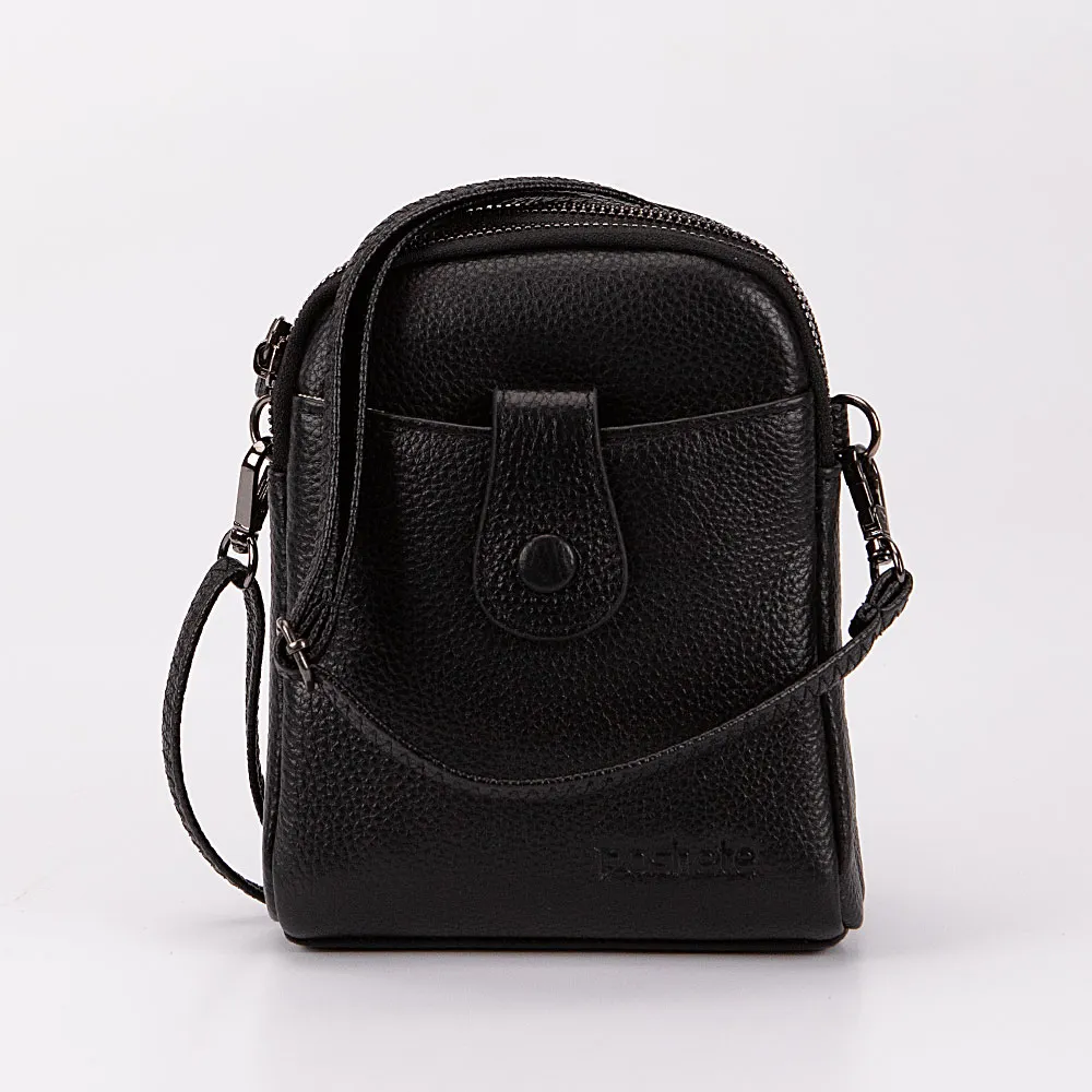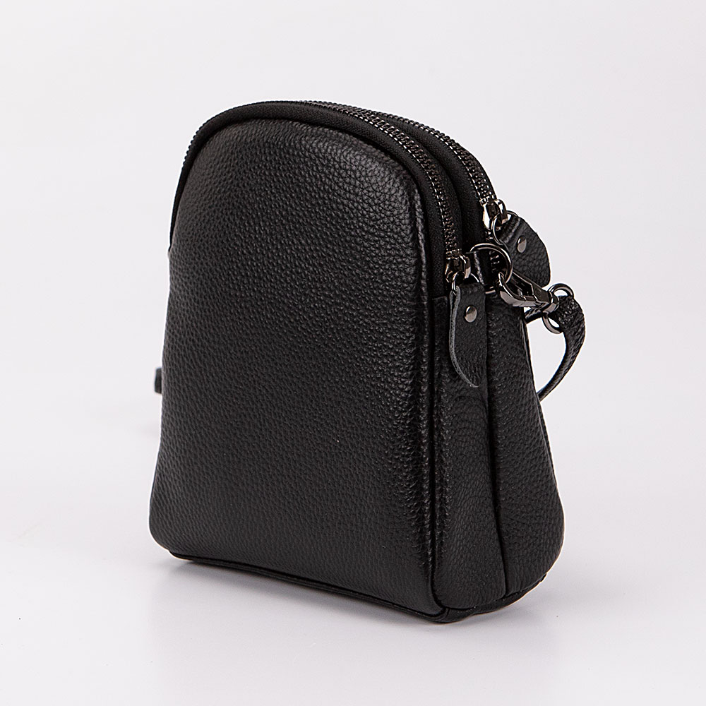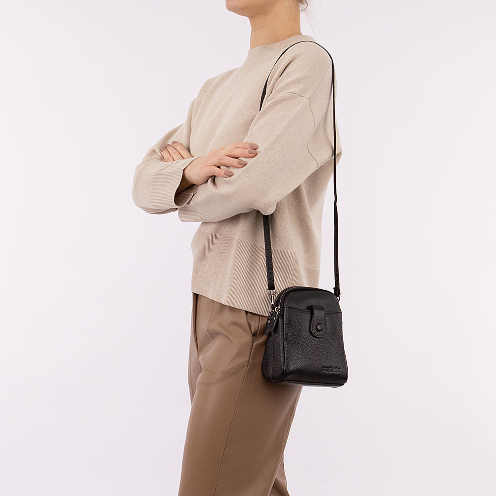 Сумка от торговой марки Poshete из натуральной кожи черного цвета. Компактная модель вертикальной ориентации со съемным регулируемым плечевым ремнем. Два отделения на молнии, с текстильной подкладкой. В одном из них – карман на молнии, в другом – накладной карман. На лицевой стороне – накладной карман с хлястиком на кнопке.