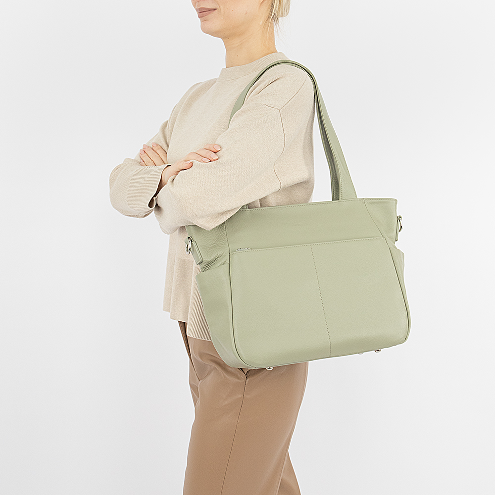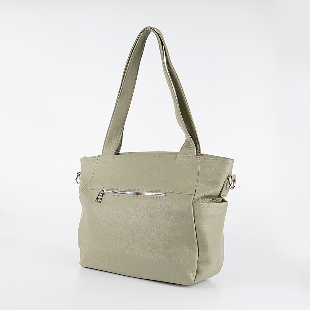 Сумка от торговой марки Valigetti из натуральной кожи. Модель с двумя удлиненными ручками. Отделение на молнии. Внутри: фирменная подкладка, перегородка и карман на молнии. На лицевой и задней сторонах – карман на молнии. По бокам – накладной карман. Дно оснащено металлическими ножками для защиты от износа.