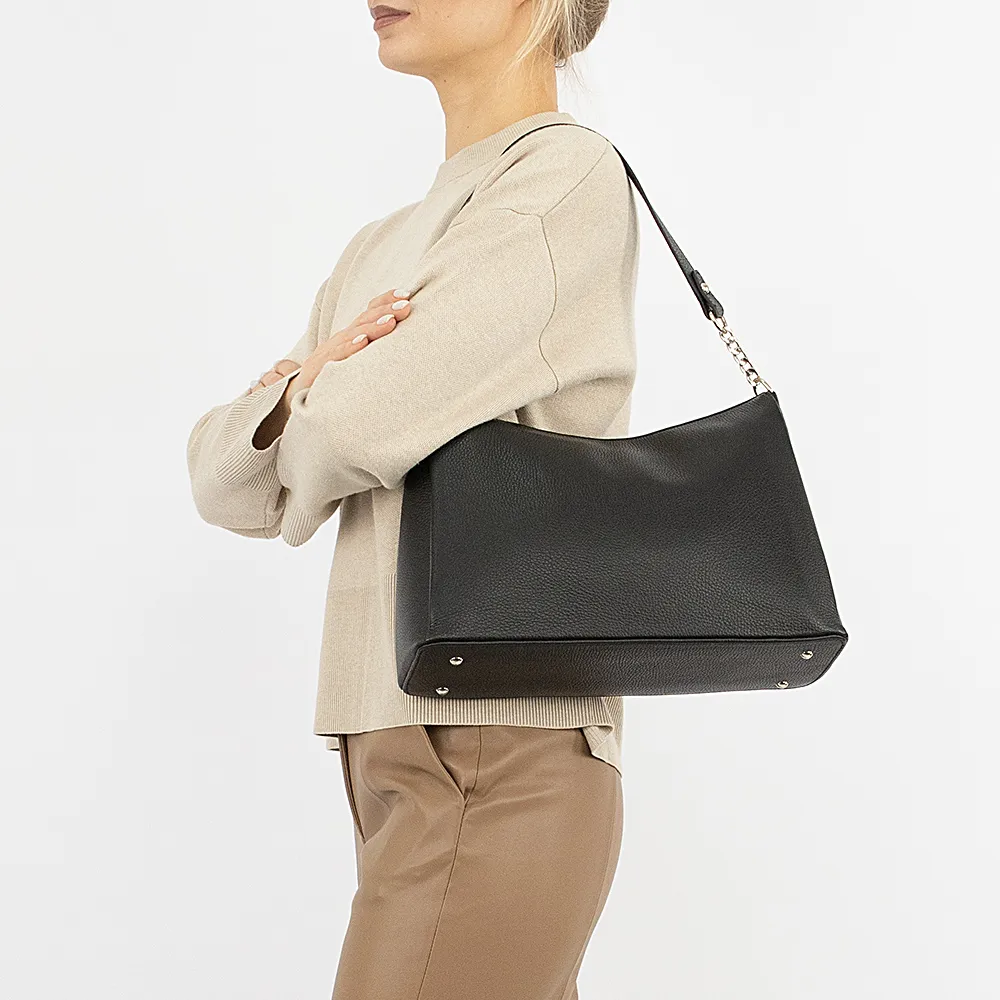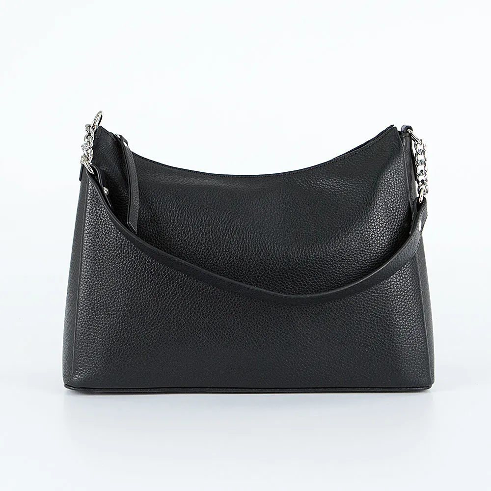 Сумка от торговой марки Francesco Molinary из натуральной кожи черного цвета. Модель с одной ручкой-цепочкой и съемным регулируемым плечевым ремнем. Отделение на молнии. Внутри: фирменная подкладка, карман на молнии, два накладных кармана. На задней стороне – карман на молнии. Дно оснащено металлическими ножками для защиты от износа.