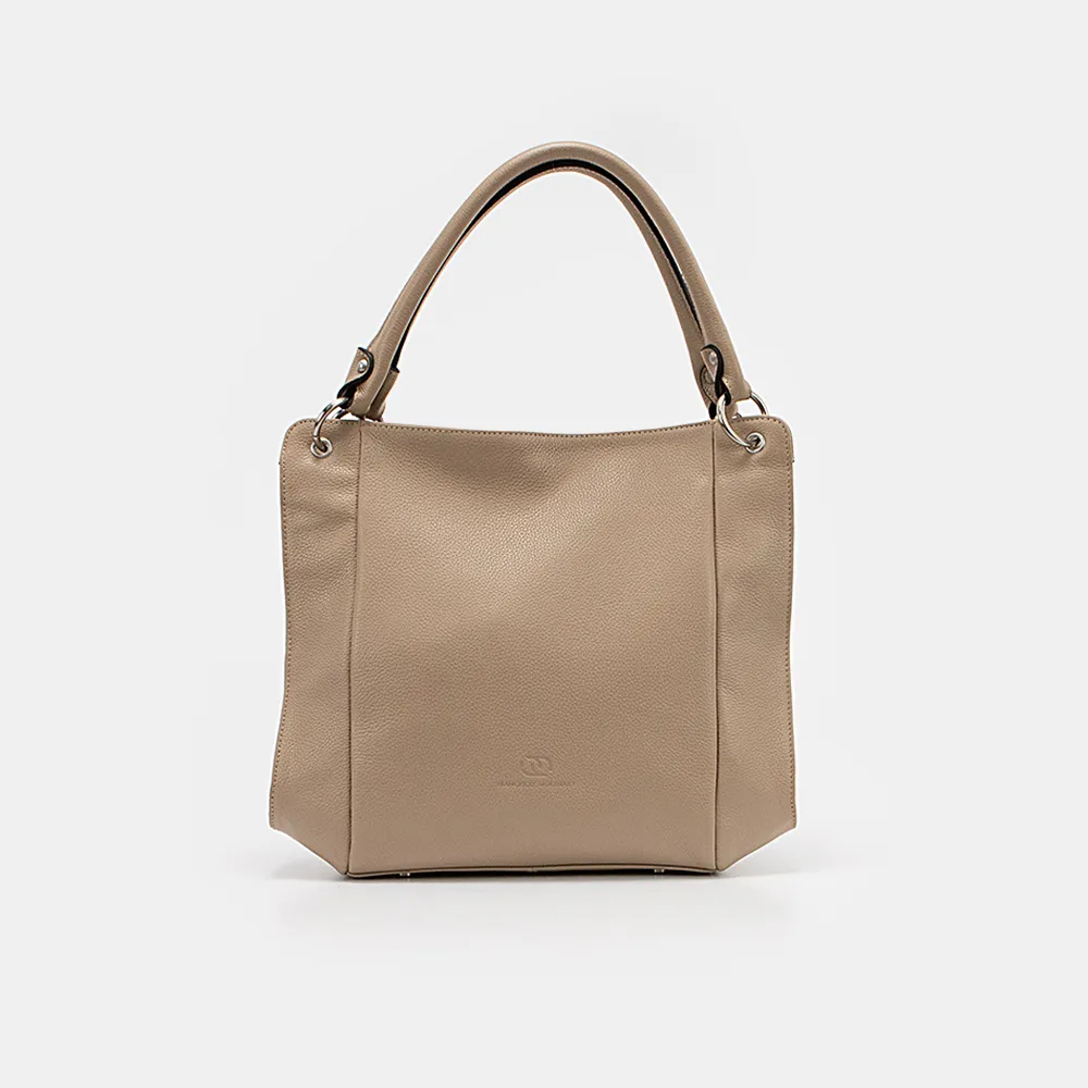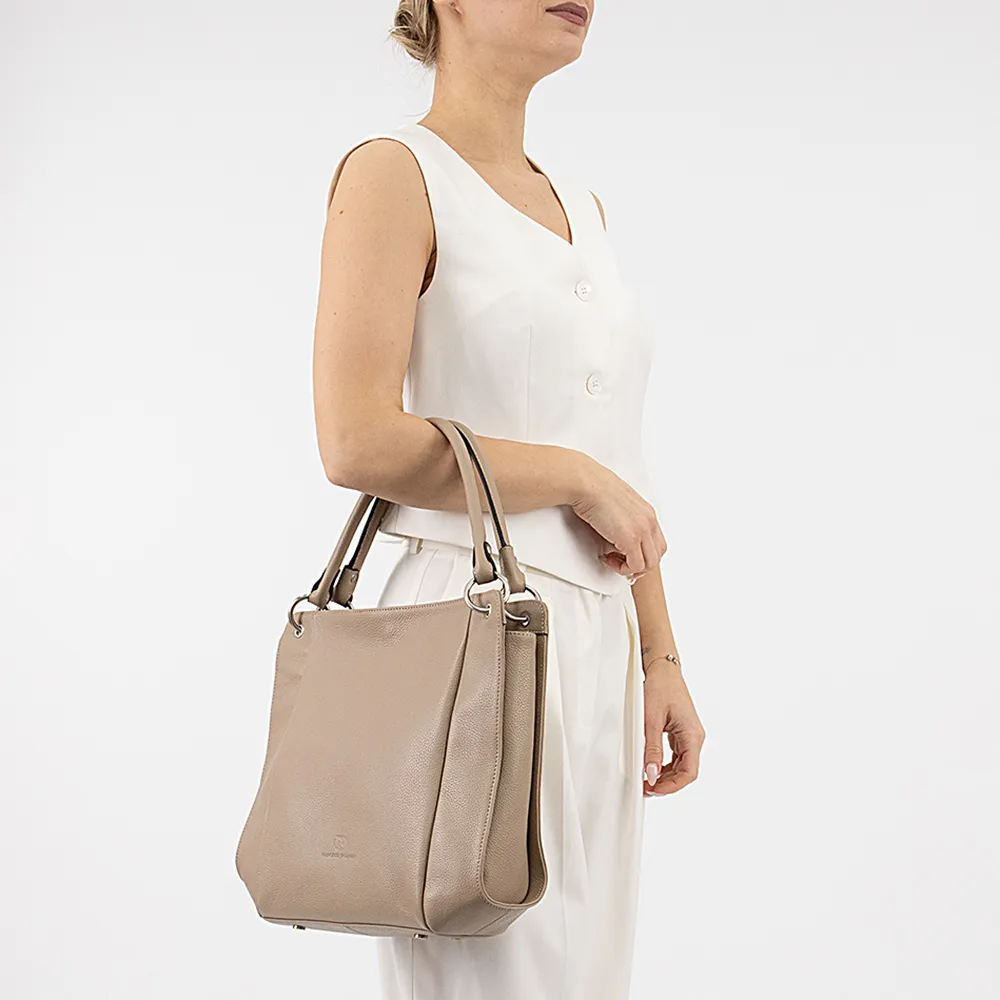 Сумка от торговой марки Francesco Molinary из натуральной кожи бежевого цвета. Модель с несъемным регулируемым плечевым ремнем. Два отделения на молнии, с фирменной подкладкой. В заднем отделении – карман на молнии, в переднем – накладной карман. На лицевой и задней сторонах – карман на молнии. Дно оснащено металлическими ножками для защиты от износа.