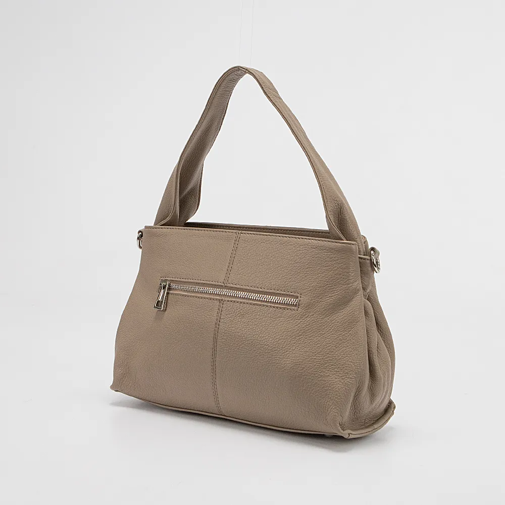 Сумка от торговой марки Poshete из натуральной кожи кофейного цвета. Модель с одной широкой ручкой и съемным регулируемым плечевым ремнем. Отделение на молнии. Внутри: текстильная подкладка, средник и карман на молнии, два накладных кармана. На задней стороне – карман на молнии. Дно оснащено металлическими ножками для защиты от износа.
