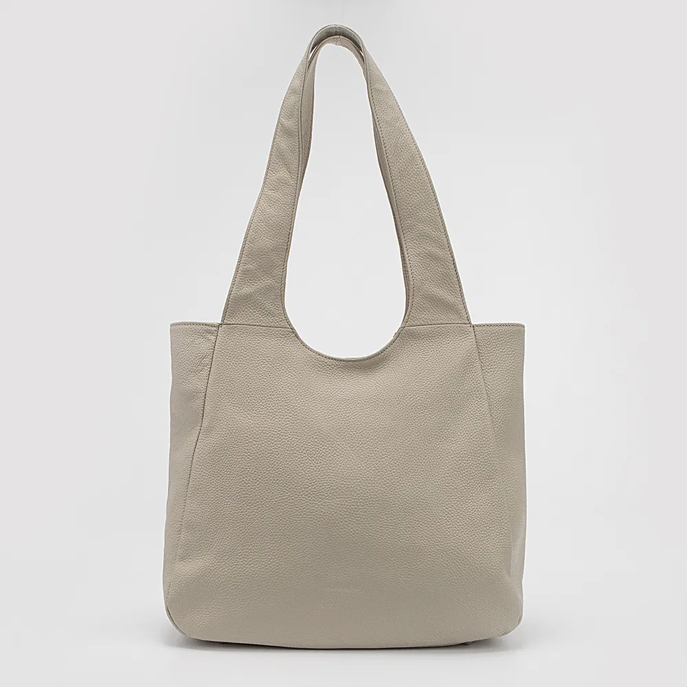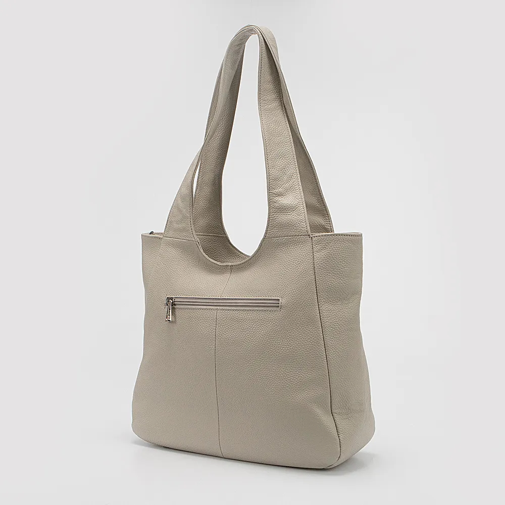 Сумка от торговой марки Poshete из натуральной кожи бежевого цвета. Модель с удлиненными двумя ручками. Отделение на молнии. Внутри: текстильная подкладка, средник и карман на молнии, два накладных кармана. На задней стороне – карман на молнии. Дно оснащено металлическими ножками для защиты от износа.