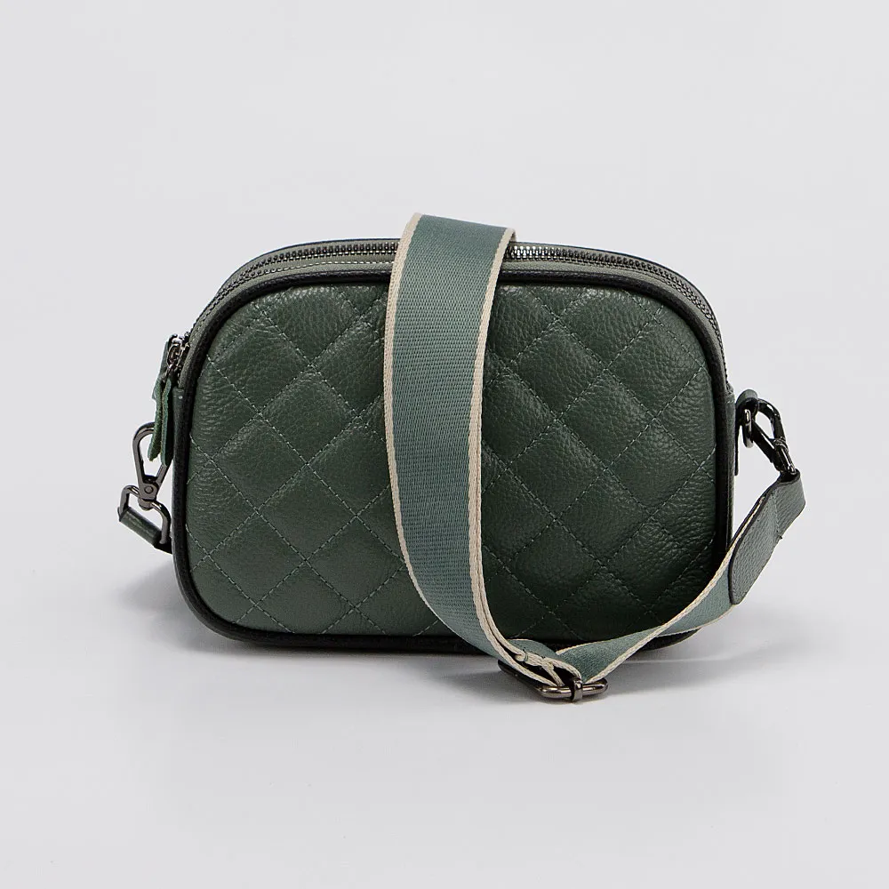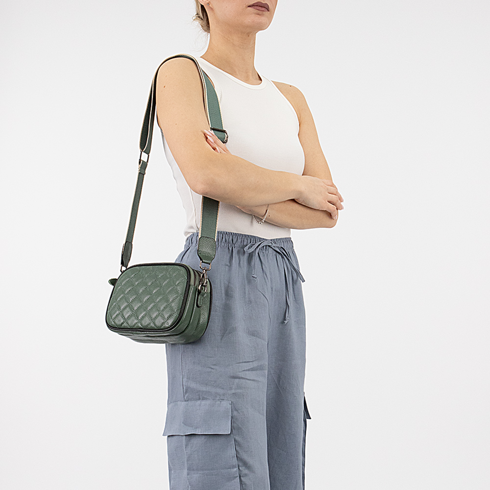 Сумка от торговой марки Poshete из натуральной кожи мятно-зеленого цвета. Лицевая сторона декорирована ромбовидной стежкой. Модель с широким съемным регулируемым плечевым ремнем, выполненным из текстильного материала с контрастной окантовкой. Три отделения на молнии, с фирменной подкладкой. В заднем – карман на молнии, в переднем – накладной карман. На задней стороне – карман на молнии.