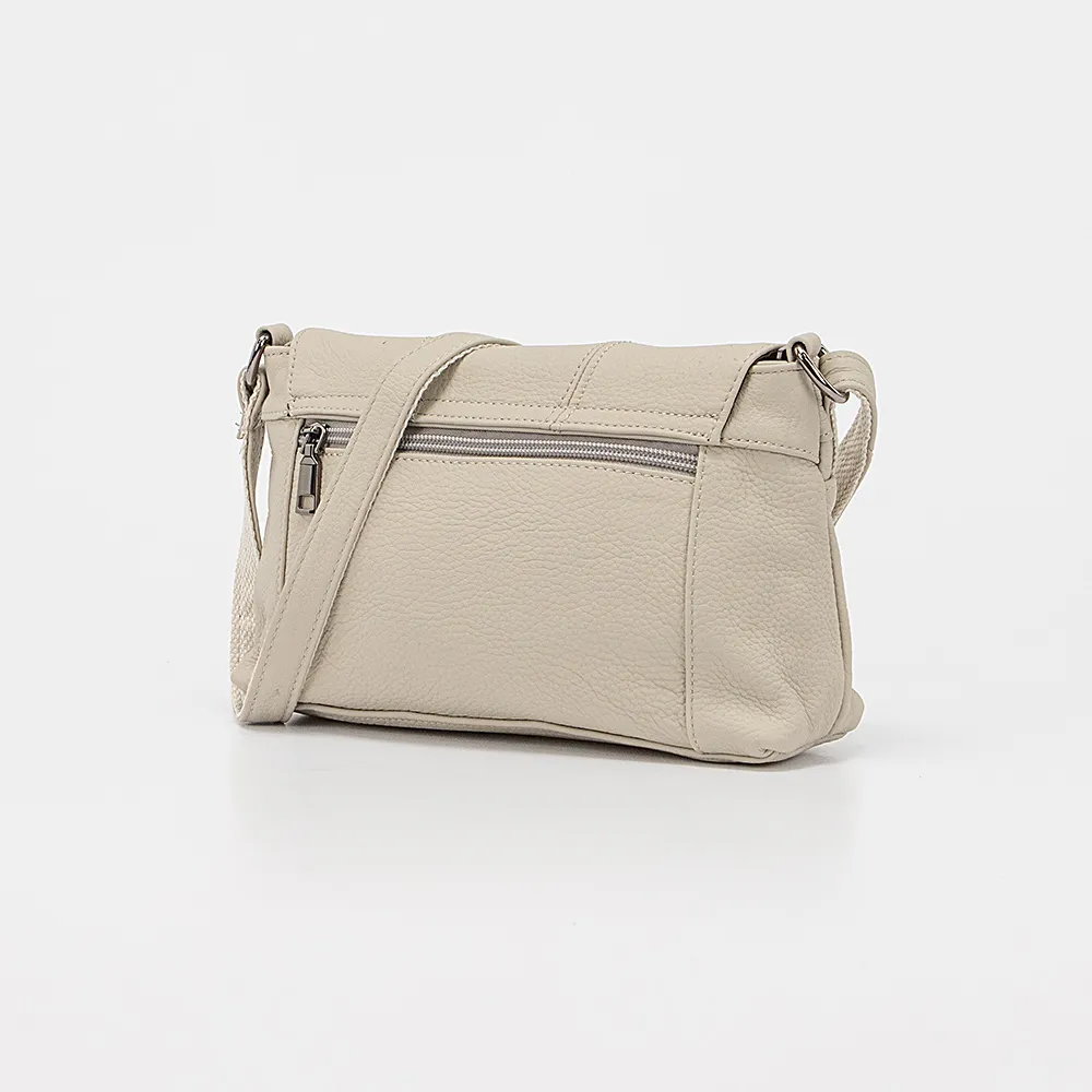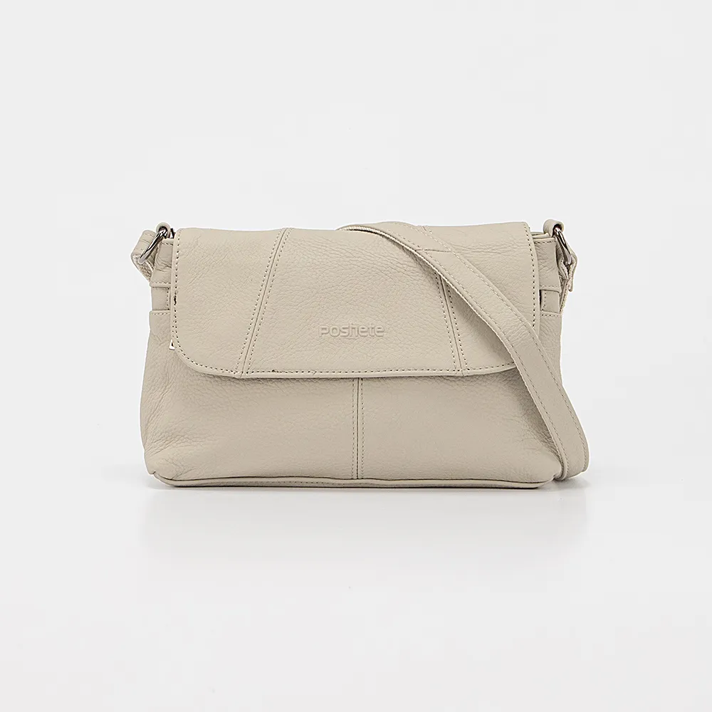 Сумка от торговой марки Poshete из натуральной кожи светло-серого цвета. Модель с несъемным регулируемым плечевым ремнем. Клапан на двух магнитных кнопках закрывает карман на молнии и отделение на молнии. Внутри: фирменная подкладка, карман на молнии, накладной карман. На задней стороне – карман на молнии.