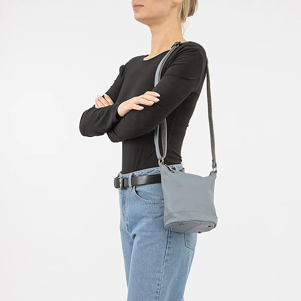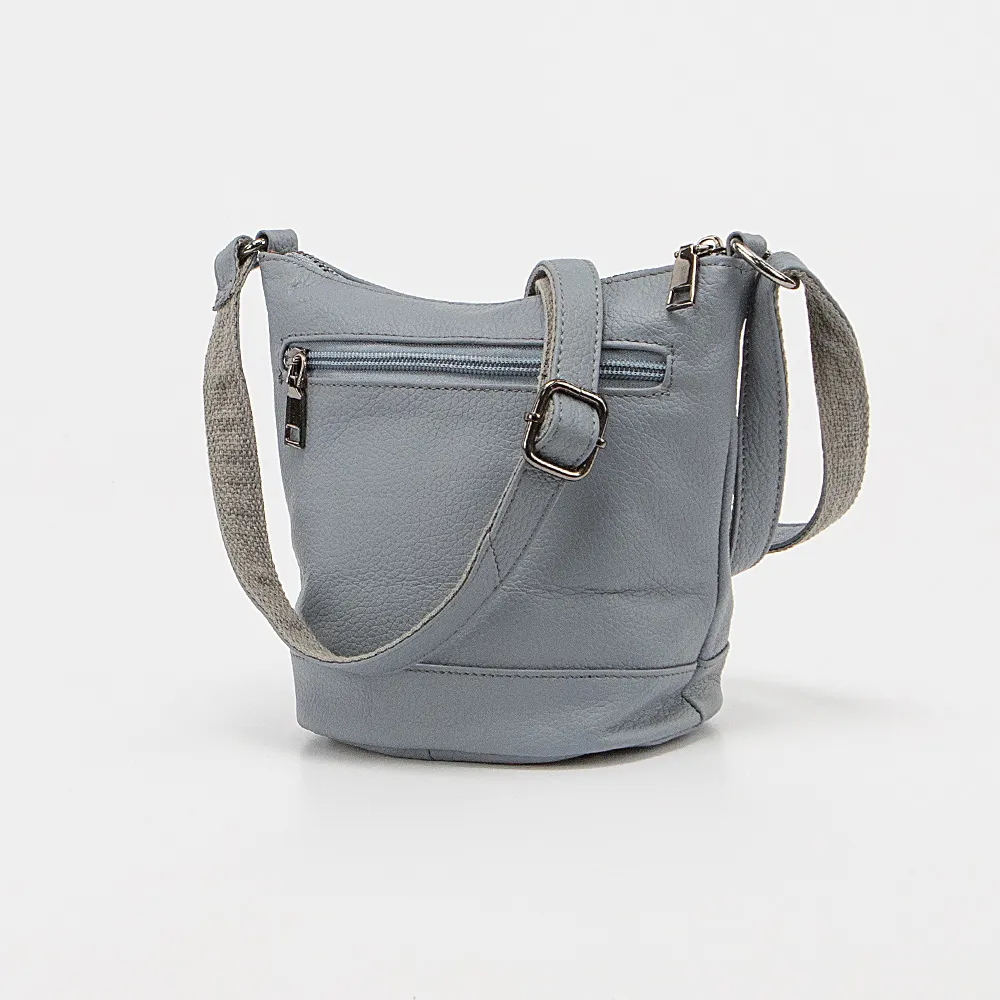 Сумка от торговой марки Poshete из натуральной кожи голубого цвета. Компактная модель с несъемным регулируемым плечевым ремнем. Отделение на молнии. Внутри: карман на молнии, накладной карман, перегородка с карманом на молнии, образующая накладной карман. На задней стороне – карман на молнии. Овальное дно оснащено металлическими ножками для защиты от износа.