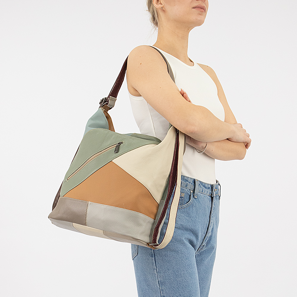 Сумка-рюкзак от торговой марки Poshete из натуральной кожи с контрастными вставками. Вместительная модель с двумя ручками, которые стягиваются в плечевые лямки. Отделение на молнии. Внутри: средник и карман на молнии, два накладных кармана. На лицевой и задней сторонах - карман на молнии.