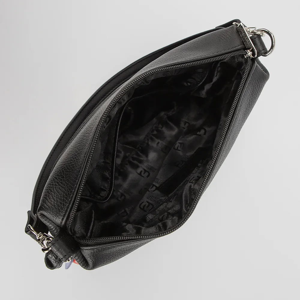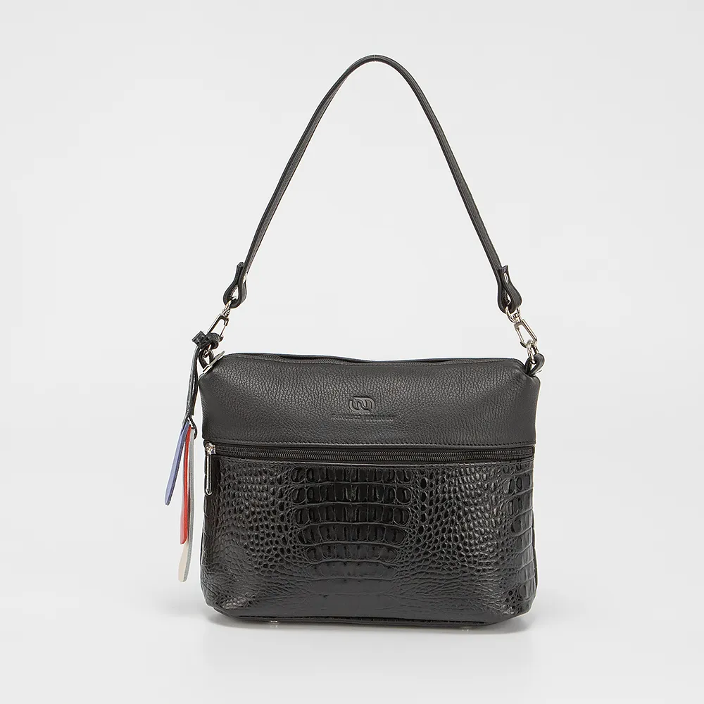 Сумка от торговой марки Francesco Molinary выполнена из натуральной кожи черного цвета с частичным тиснением под рептилию. Модель с удлиненной ручкой и съемным регулируемым плечевым ремнем. Декорирована цветными кожаными подвесками. Отделение на молнии. Внутри: фирменная текстильная подкладка, карман на молнии, накладной карман. С лицевой и задней стороны - карман на молнии. Дно оснащено металлическими ножками для защиты от износа.