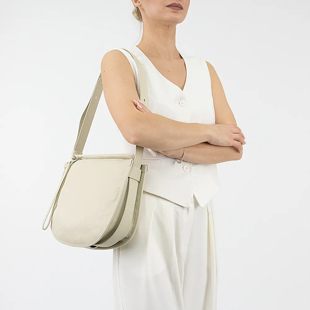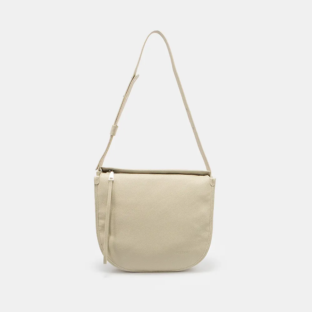 Сумка от торговой марки Poshete из натуральной кожи бежевого цвета. Модель с несъемным регулируемым плечевым ремнем на кобурных кнопках; в нижней части имеется шлевка для крепления ремня по низу. Отделение на скрытой молнии. Внутри: фирменная подкладка, карман на молнии, накладной карман. На задней стороне – карман на молнии.