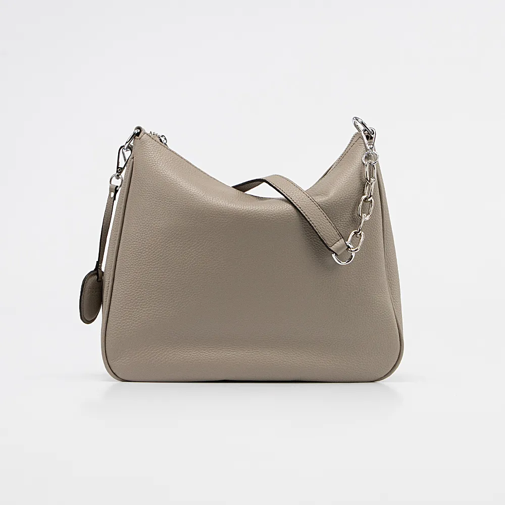 Сумка от торговой марки Poshete из натуральной кожи кофейного цвета. Модель среднего размера со съемной ручкой-цепочкой и съемным регулируемым плечевым ремнем. Отделение на молнии. Внутри: фирменная подкладка, средник и карман на молнии, накладной карман. На задней стороне – карман на молнии. В комплекте имеется съемным брелок с логотипом бренда.