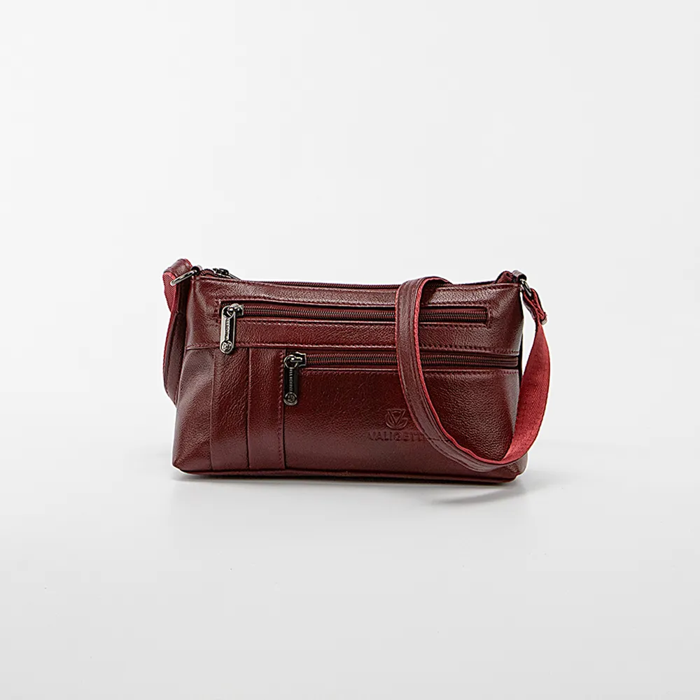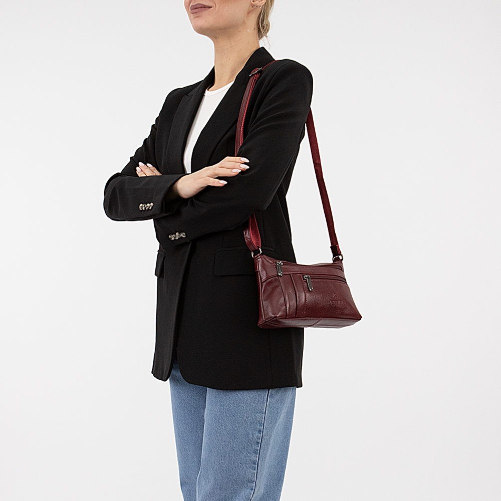 Сумка от торговой марки Valigetti из натуральной кожи винно-бордового цвета. Компактная модель со съемным регулируемым плечевым ремнем. Отделение на молнии. Внутри: фирменная подкладка, средник и карман на молнии. На лицевой стороне – два кармана на молнии. На задней стороне – карман на молнии.