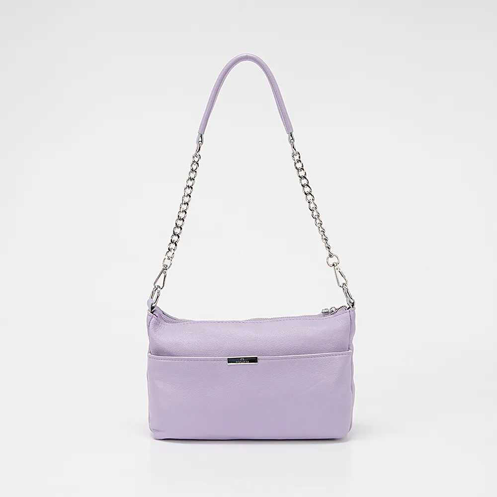 Сумка от торговой марки Poshete из натуральной кожи сиреневого цвета. Модель с удлиненной съемной ручкой-цепочкой, съемным регулируемым плечевым ремнем. Отделение на молнии. Внутри: фирменная подкладка, карман на молнии, накладной карман. На лицевой стороне – карман на молнии. На задней – вместительный накладной карман на молнии; внутри: перегородка с карманом на молнии. Задняя сторона декорирована ромбовидной стежкой.