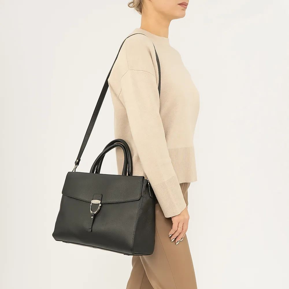 Сумка от торговой марки Francesco Molinary из натуральной кожи черного цвета. Модель с двумя ручками и съемным регулируемым плечевым ремнем. Клапан на магнитной кнопке закрывает карман на молнии и отделение на молнии. Внутри: средник и карман на молнии, накладной карман. Дно оснащено накладками для защиты от износа.