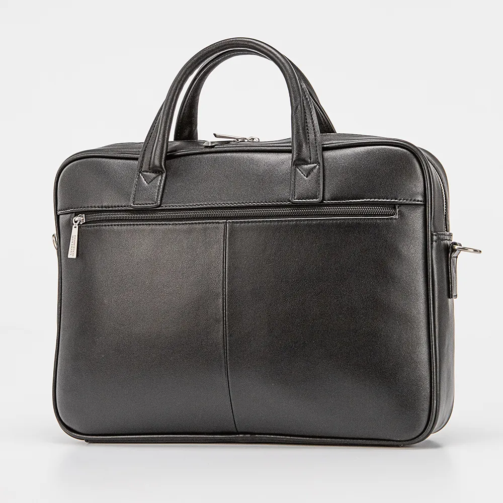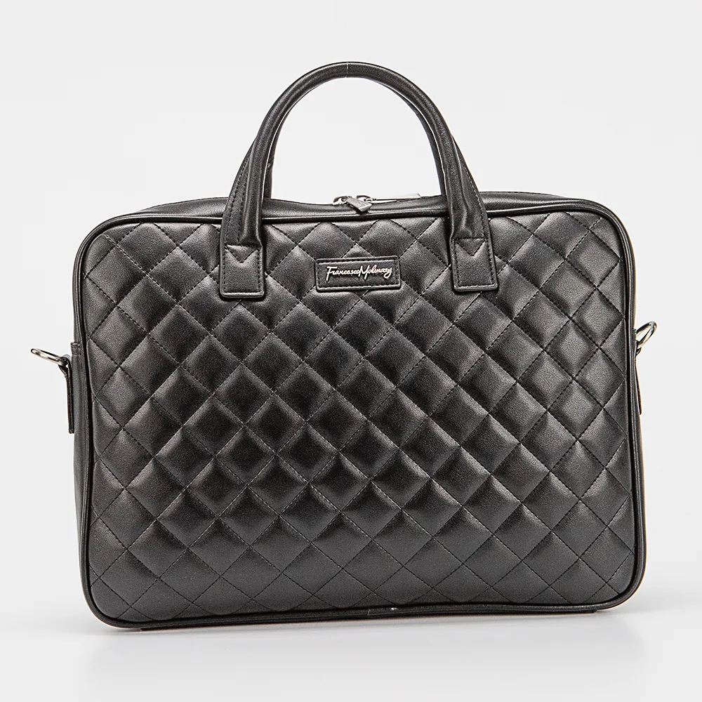 Сумка от торговой марки Francesco Molinary из натуральной кожи черного цвета. Лицевая сторона декорирована ромбовидной стежкой. Модель с двумя ручками и съемным регулируемым плечевым ремнем. Отделение на молнии; с уплотненными стенками. Внутри: фирменная подкладка, накладной карман с уплотненной стенкой для ноутбука, карман на молнии, органайзер. На задней стороне – вместительный карман на молнии.