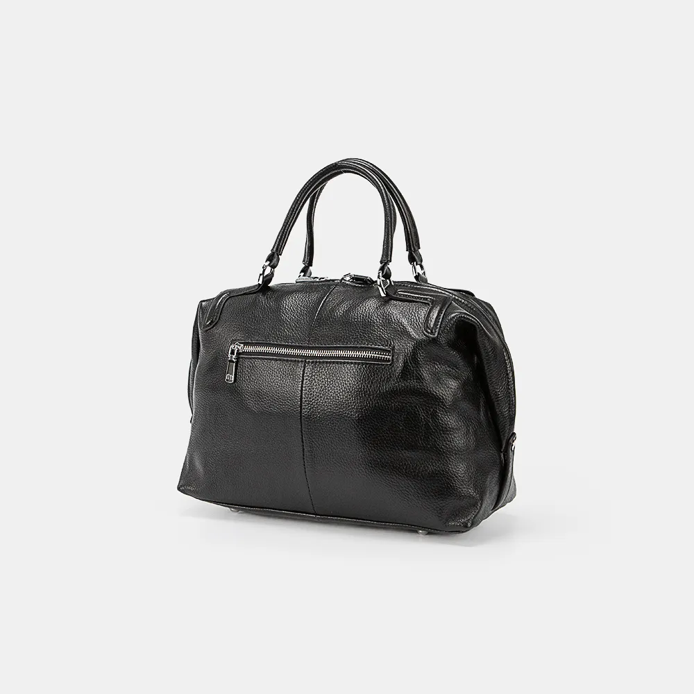 Сумка от торговой марки Poshete из натуральной кожи черного цвета. Модель боулер с двумя ручками, съемным регулируемым плечевым ремнем. Отделение на молнии. Внутри: фирменная подкладка, карман на молнии. На задней стороне – карман на молнии. Дно оснащено металлическими ножками для защиты от износа.