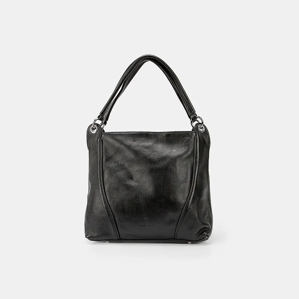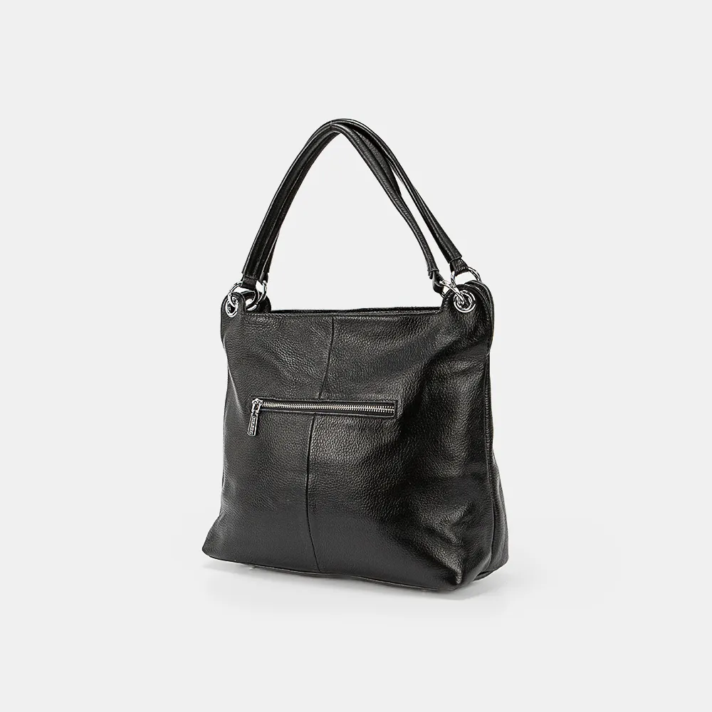 Сумка от торговой марки Poshete из натуральной кожи черного цвета. Вместительная модель с двумя ручками на кольцах в люверсах. Отделение на молнии. Внутри: фирменная подкладка, средник и карман на молнии, накладной карман. На задней стороне – карман на молнии. Дно оснащено металлическими ножками для защиты от износа. Подойдет для документов формата А4.