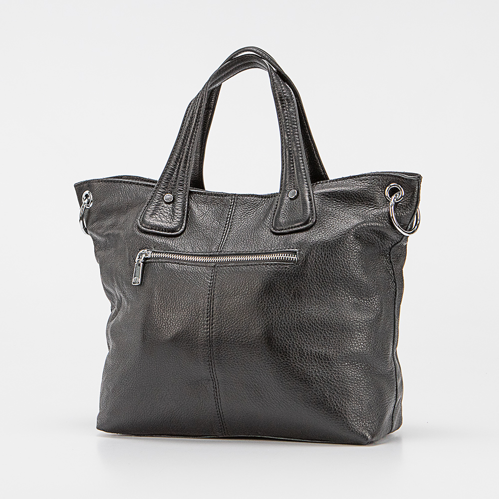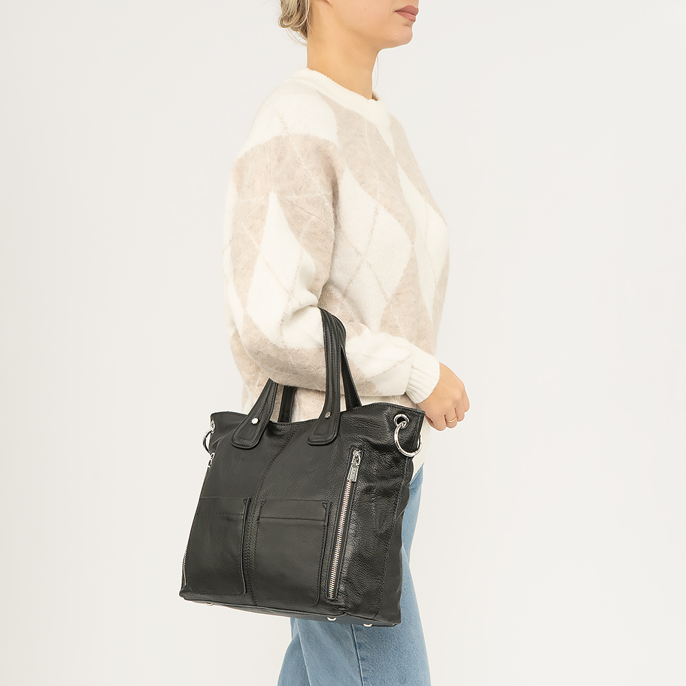 Сумка от торговой марки Poshete из натуральной кожи черного цвета. Модель с двумя ручками, съемным регулируемым плечевым ремнем, выполненным из текстильного материала. Отделение на молнии. Внутри: текстильная подкладка, средник и карман на молнии, накладной карман. На лицевой стороне – два вертикальных карман на молнии, два накладных кармана без застежки. На задней стороне – карман на молнии. Дно сумки оснащено металлическими ножками от износа.