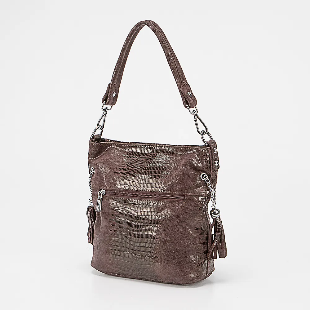 Сумка от торговой марки Poshete выполнена из мягкой натуральной кожи коричневого цвета с лазерной обработкой. Декорирована оригинальным принтом под змеиную кожу и подвесками-кисточками на цепочках по бокам. Модель со съемной ручкой и съемным регулируемым плечевым ремнем. Отделение на молнии. Внутри: фирменная подкладка, средник и карман на молнии, два накладных кармана. На лицевой и задней сторонах – карман на молнии. Овальное дно оснащено металлическими ножками для защиты от износа.