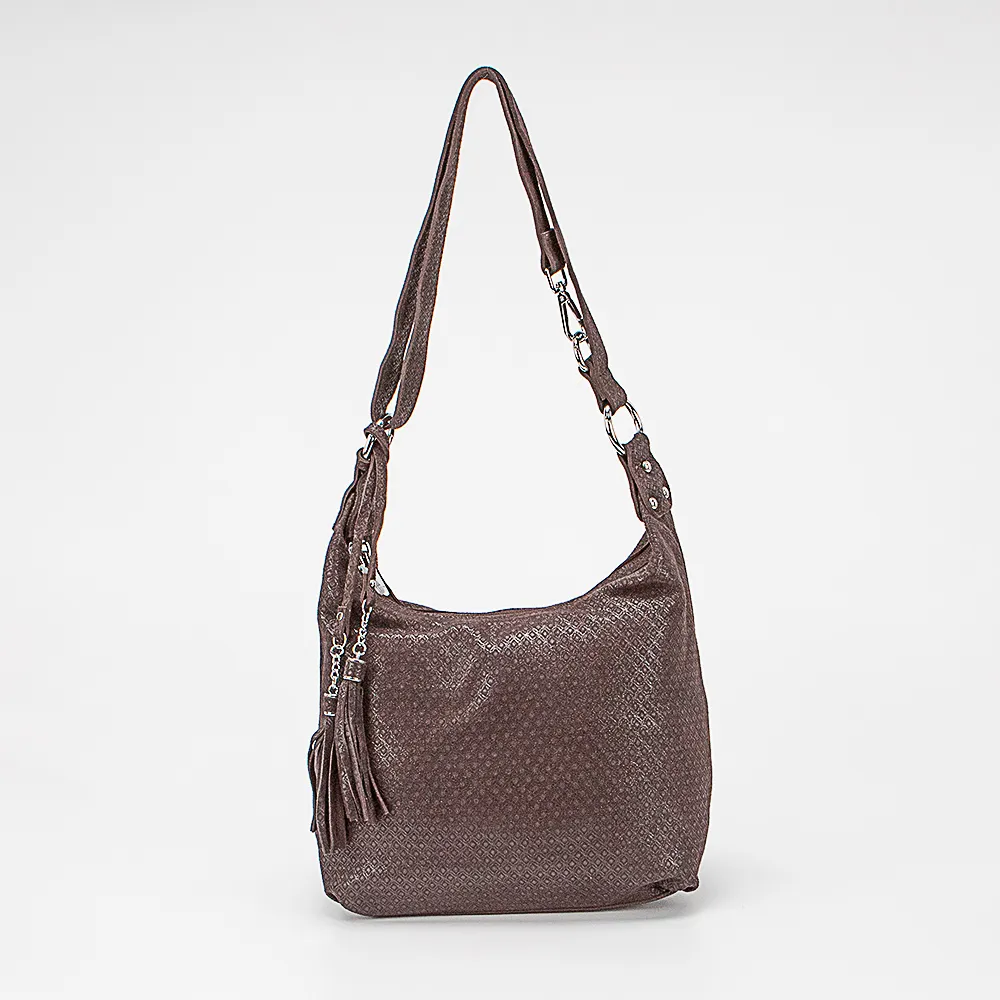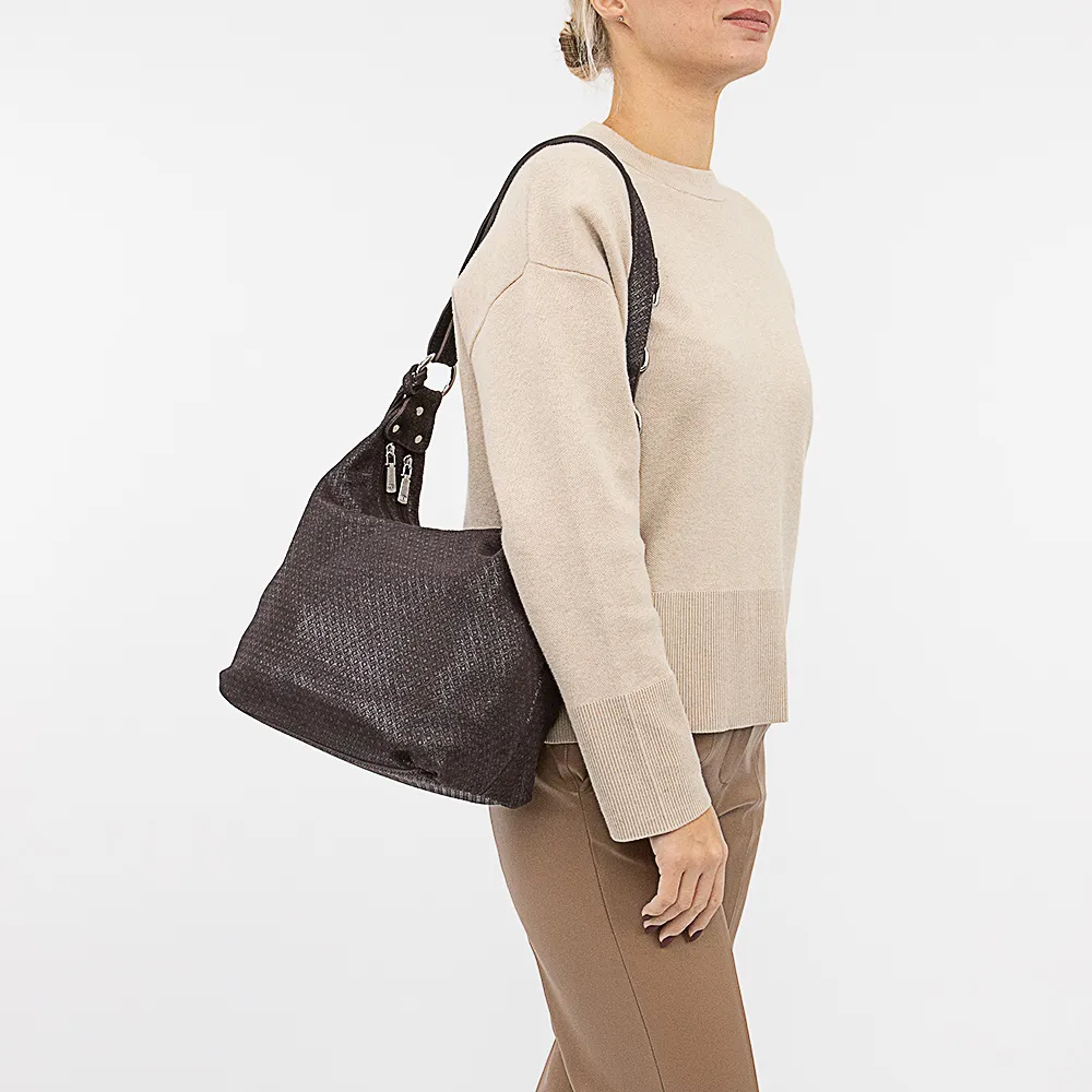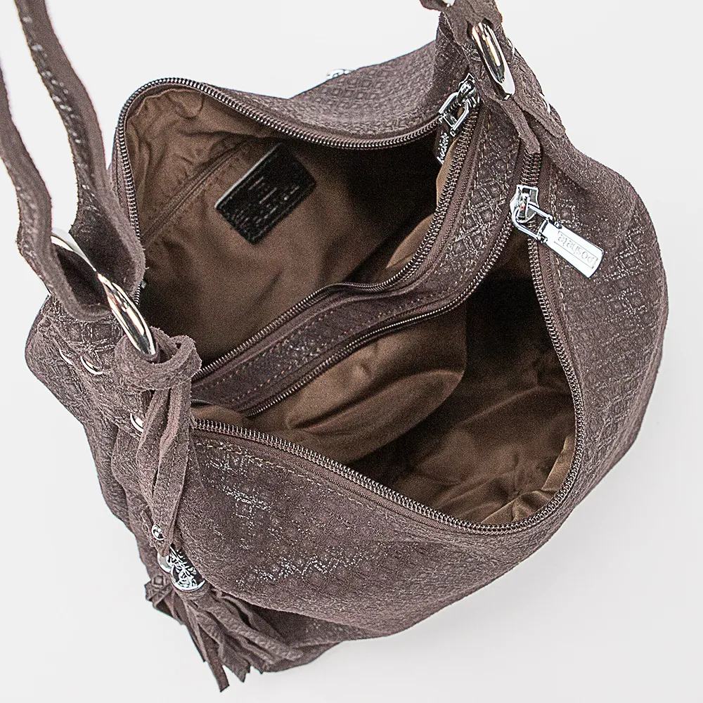 Сумка от торговой марки Poshete из натуральной мягкой кожи в коричневом цвете с лазерной обработкой и оригинальным узорным тиснением. Модель со съемным регулируемым плечевым ремнем, который можно использовать в качестве удлиненной ручки. Два отделения на молнии, с текстильной подкладкой. В одном из них – карман на молнии, в другом – два накладных кармана. На задней стороне – карман на молнии.