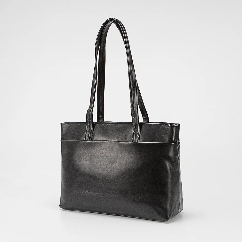 Сумка от торговой марки Poshete из натуральной гладкой кожи черного цвета. Модель с двумя удлиненными ручками. Отделение на молнии. Внутри: фирменная подкладка, средник и карман на молнии, накладной карман. На лицевой стороне – вместительный накладной карман на магнитной кнопке, два кармана на молнии. На задней стороне – накладной карман на магнитной кнопке.