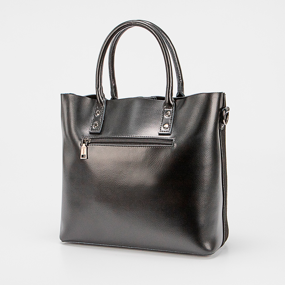 Сумка от торговой марки Poshete из натуральной кожи и замши черного цвета. Модель с двумя ручками и съемным регулируемым плечевым ремнем. Отделение на молнии. Внутри: фирменная подкладка, средник и карман на молнии. На лицевой и задней сторонах – карман на молнии. Дно сумки оснащено металлическими ножками для защиты от износа.