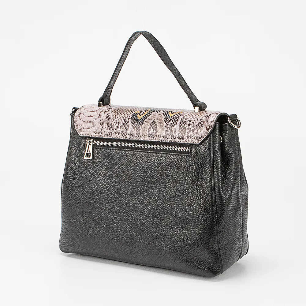 Сумка от торговой марки Poshete из натуральной кожи черного цвета. Модель с одной ручкой и съемным регулируемым плечевым ремнем. Закрывается фигурным клапаном на поворотном замке. Клапан декорирован эффектным тиснением под змеиную кожу. Отделение на молнии. Внутри: фирменная подкладка, средник и карман на молнии, накладной карман. На задней стороне – карман на молнии. Дно оснащено металлическими ножками для защиты от износа.