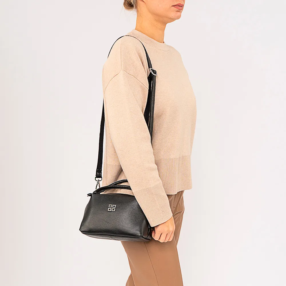 Сумка от торговой марки Poshete из натуральной кожи черного цвета. Модель с двумя ручками и съемным регулируемым плечевым ремнем. Отделение на молнии. Внутри: текстильная подкладка, карман на молнии, накладной карман. На задней стороне – карман на молнии.