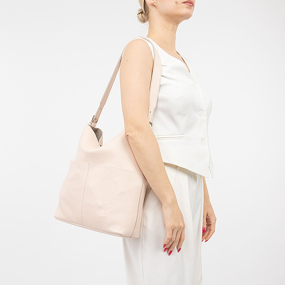 Сумка от торговой марки Francesco Molinary из натуральной кожи нежно-розового цвета. Модель вертикальной ориентации с широким регулируемым плечевым ремнем. Отделение фиксируется магнитной кнопкой. Внутри: без подкладки, накладной кожаный карман на молнии. На лицевой стороне – два накладных кармана.