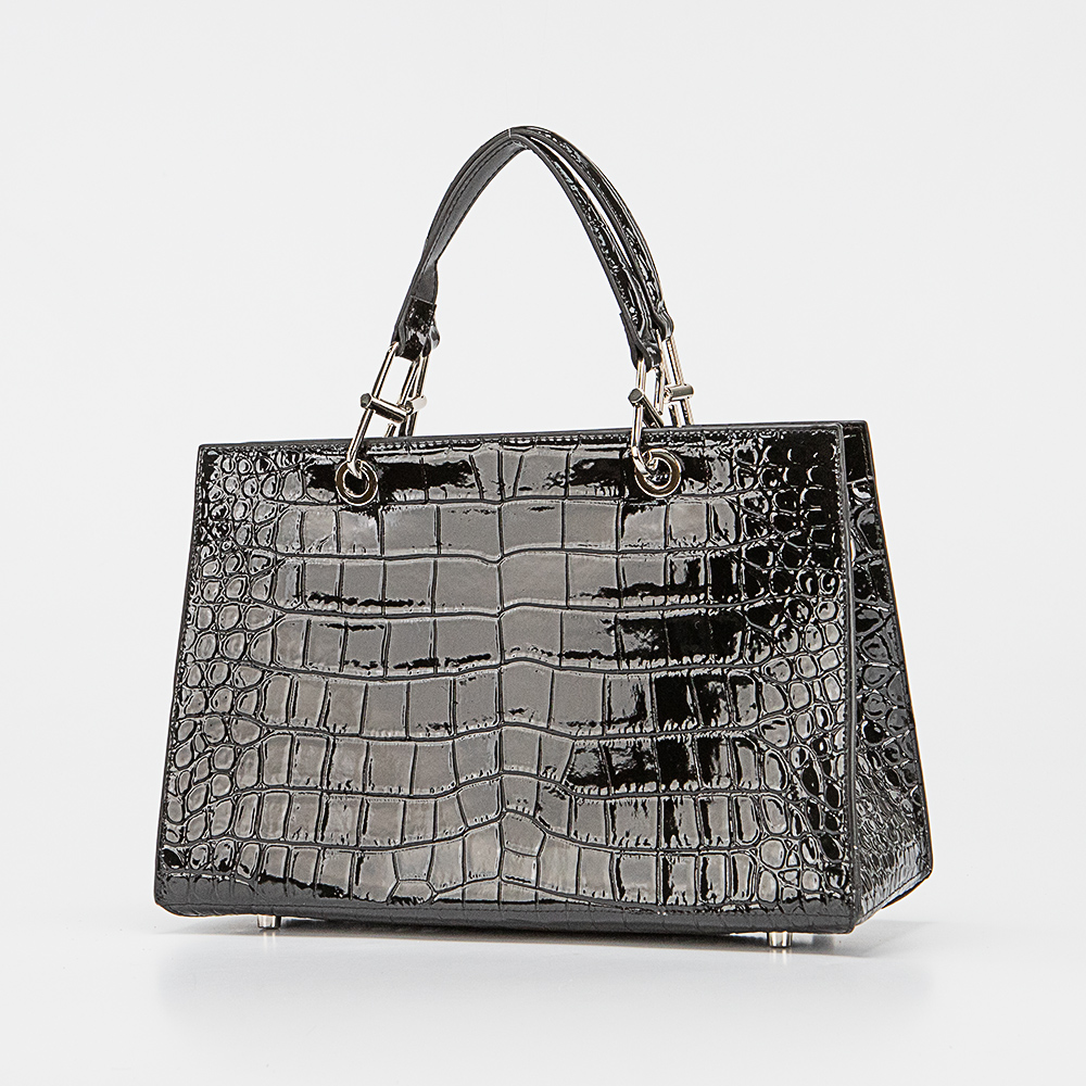 Сумка от торговой марки Valigetti из натуральной лакированной кожи черного цвета с тиснением под крокодила. Модель с двумя плотными ручками, съемным регулируемым плечевым ремнем. Отделение на молнии. Внутри: фирменная подкладка, карман на молнии, накладной карман, перегородка с карманом на молнии, образующая накладной карман. Дно оснащено металлическими ножками для защиты от износа.