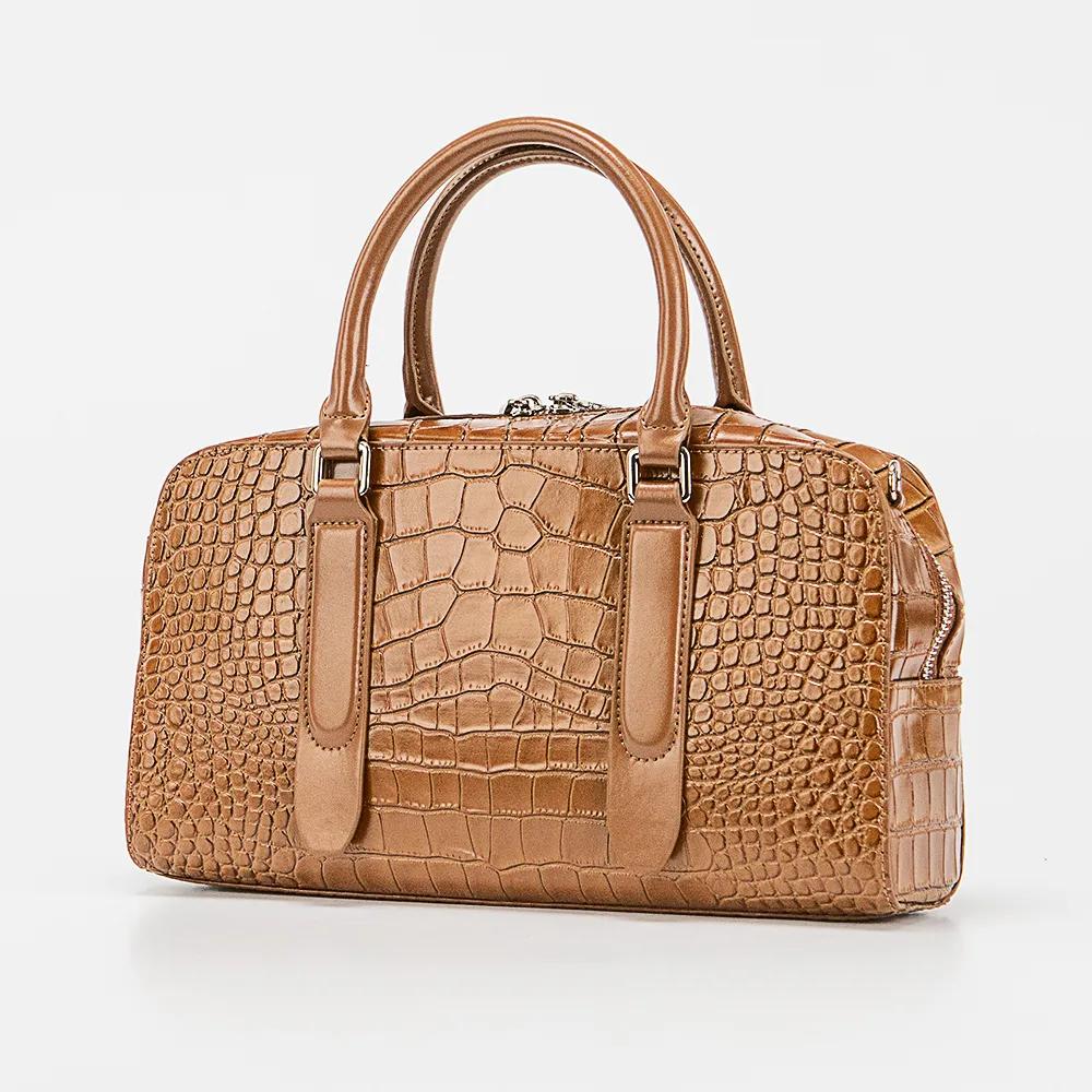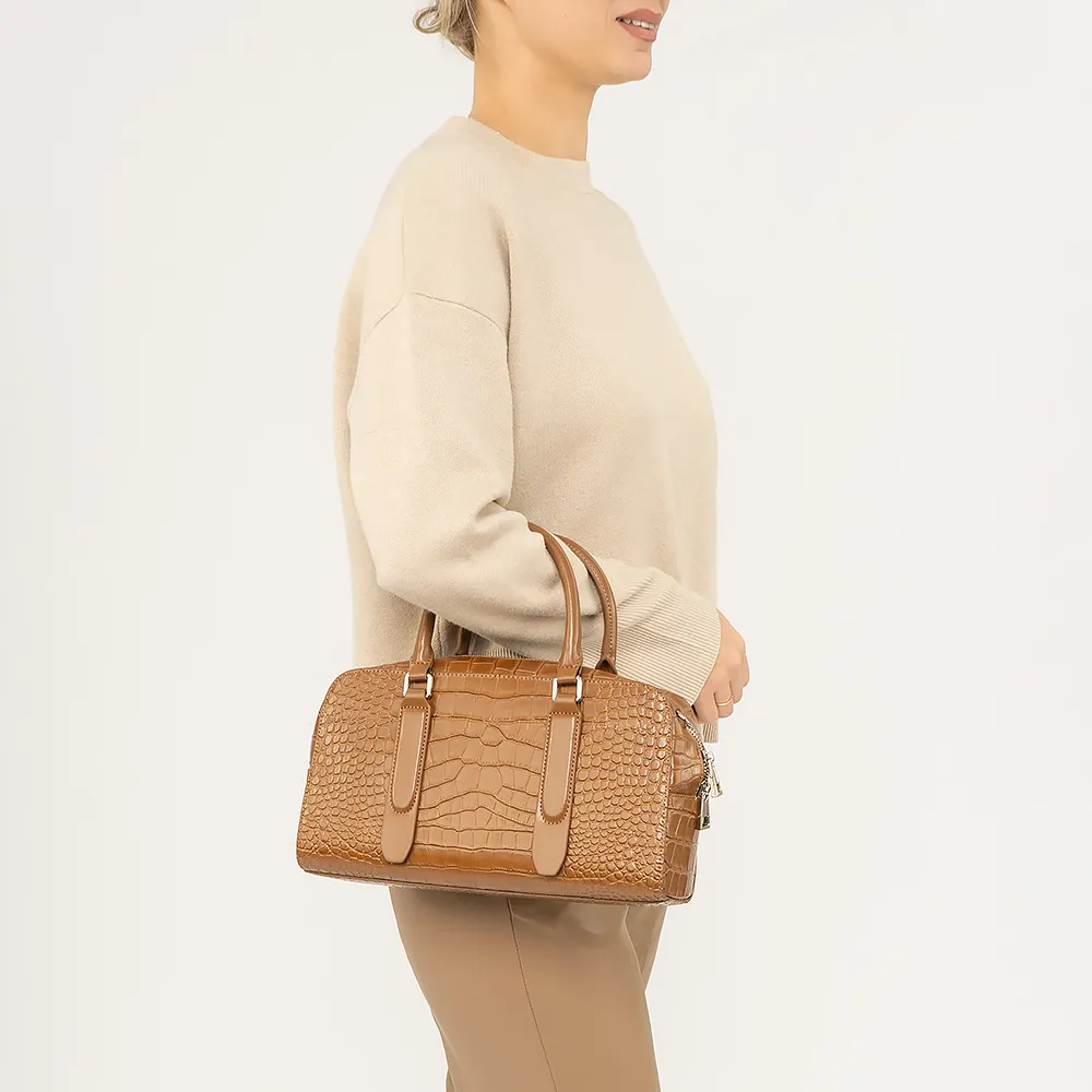 Сумка от торговой марки Valigetti из натуральной кожи коричневого цвета с тиснением под крокодила. Модель с двумя плотными ручками, съемным регулируемым плечевым ремнем. Отделение на молнии. Внутри: фирменная подкладка, карман на молнии, накладной карман.