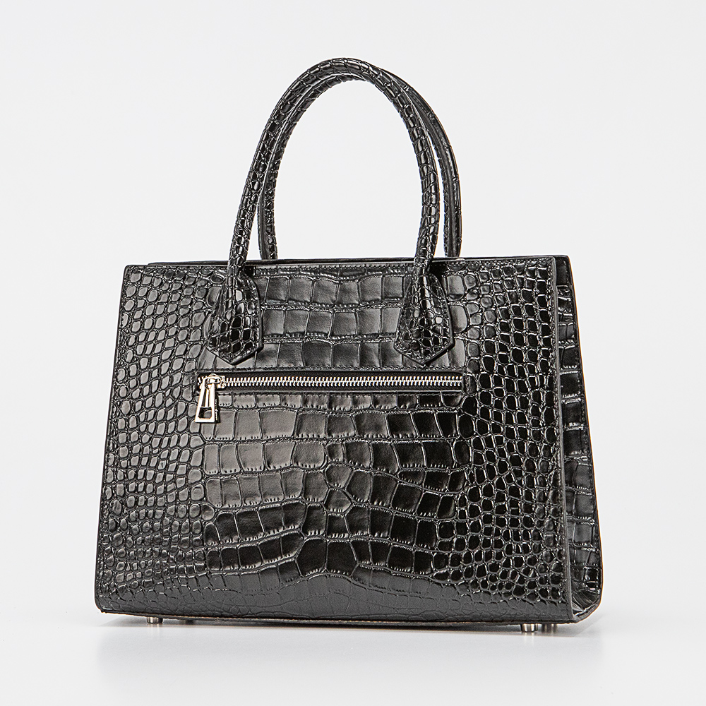 Сумка от торговой марки Valigetti из натуральной лакированной кожи черного цвета с тиснением под крокодила. Модель с двумя плотными ручками, съемным регулируемым плечевым ремнем. Отделение на молнии. Внутри: фирменная подкладка, средник и карман на молнии, накладной карман. Дно оснащено металлическими ножками для защиты от износа.