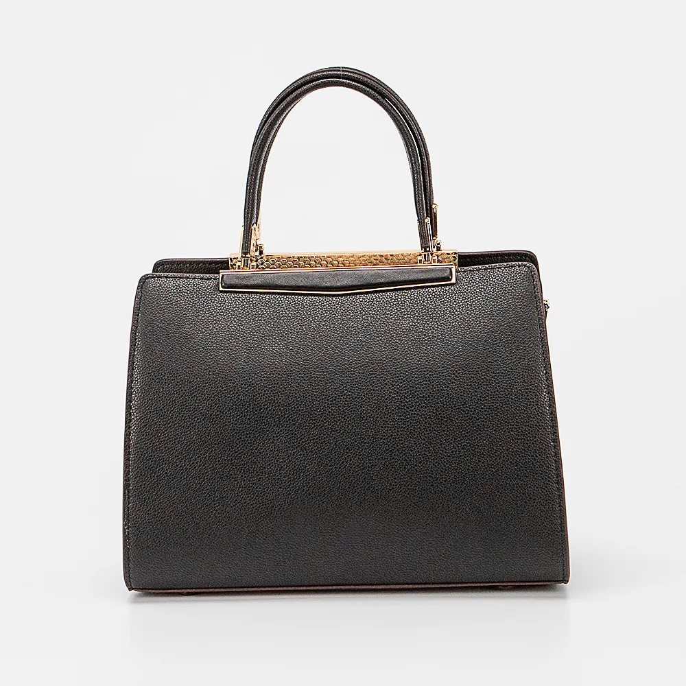 Сумка от торговой марки Poshete из натуральной кожи черного цвета. Модель с двумя ручками и съемным регулируемым плечевым ремнем. Отделение на молнии. Внутри: фирменная подкладка, средник и карман на молнии, накладной карман. На задней стороне – карман на молнии. На дне имеются кожаные накладки для защиты от износа.