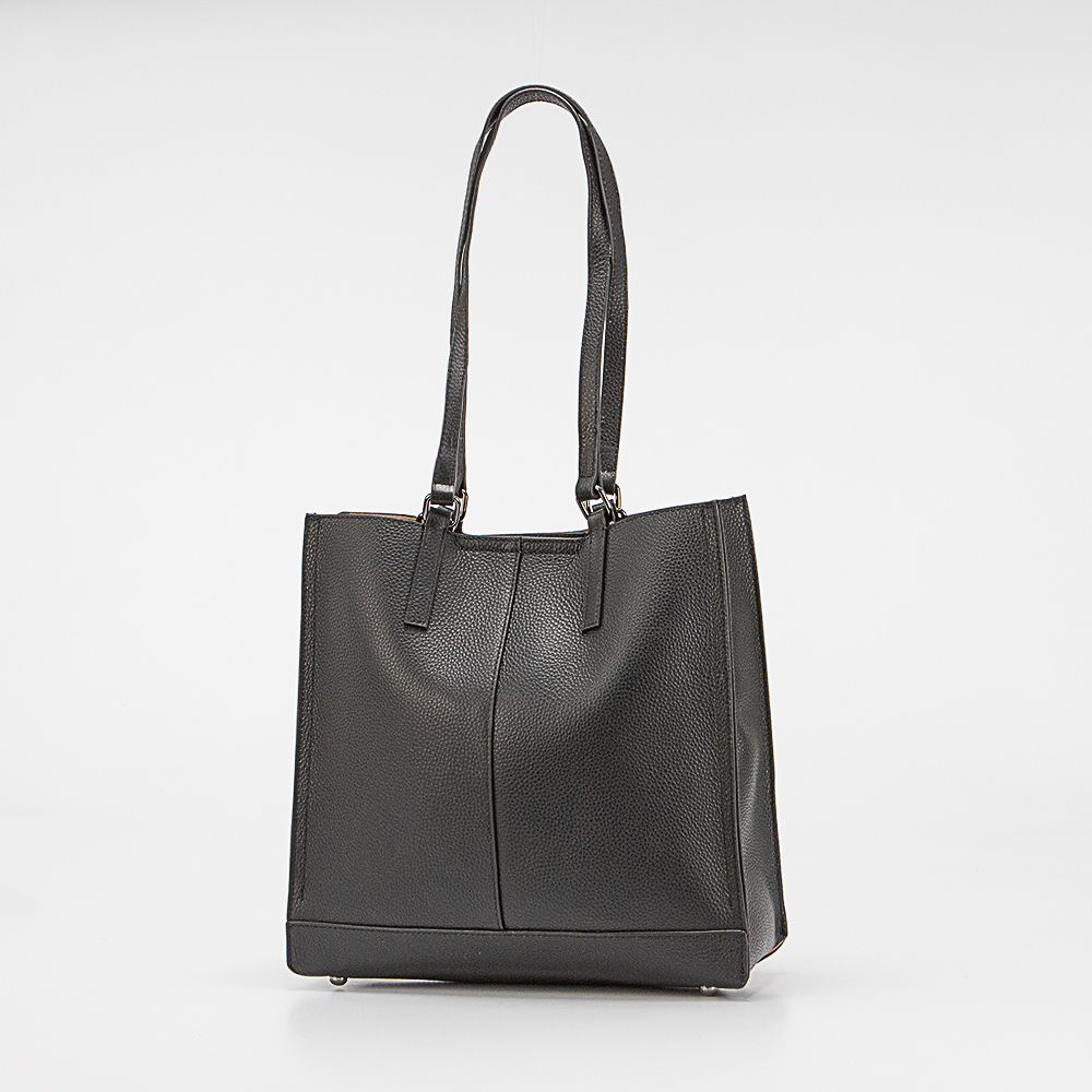 Сумка от торговой марки Poshete из натуральной кожи черного цвета. Лицевая сторона декорирована ремешком с пряжкой. Модель с двумя удлиненными ручками. Три отделения; крайние фиксируются магнитной кнопкой. Среднее отделение на молнии; внутри: карман на молнии, накладной карман. Дно оснащено металлическими ножками для защиты от износа.