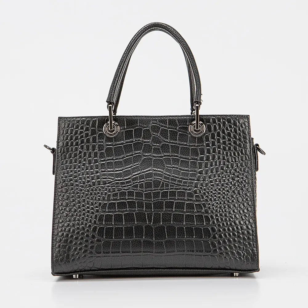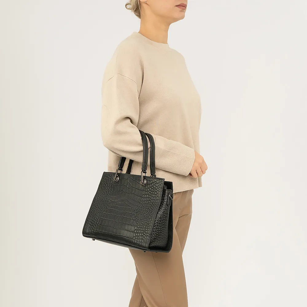 Сумка от торговой марки Poshete из натуральной кожи черного цвета с тиснением под крокодила. Модель с двумя ручками и съемным регулируемым плечевым ремнем. Отделение на молнии. Внутри: текстильная подкладка, средник и карман на молнии, накладной карман. Дно оснащено металлическими ножками для защиты от износа.