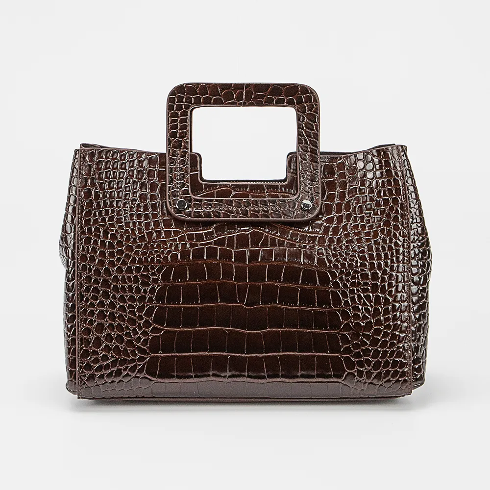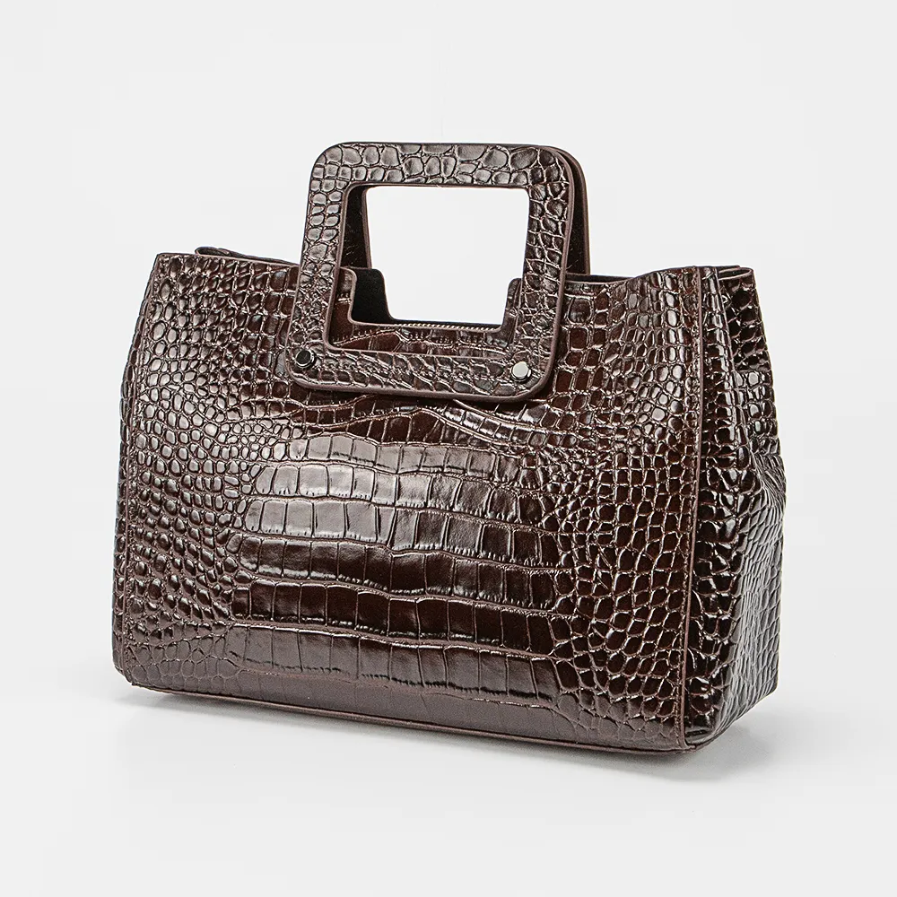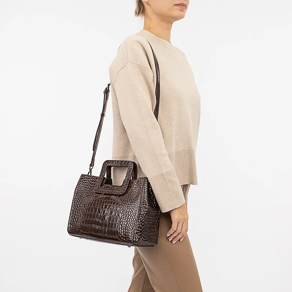 Сумка от торговой марки Francesco Molinary из натуральной кожи коричневого цвета с тиснением под крокодила. Модель с двумя короткими квадратными ручками и съемным регулируемым плечевым ремнем. Отделение на молнии. Внутри: фирменная подкладка, перегородка, разделяющая пространство на два отсека, карман на молнии и накладной карман. Дно оснащено металлическими ножками для защиты от износа.