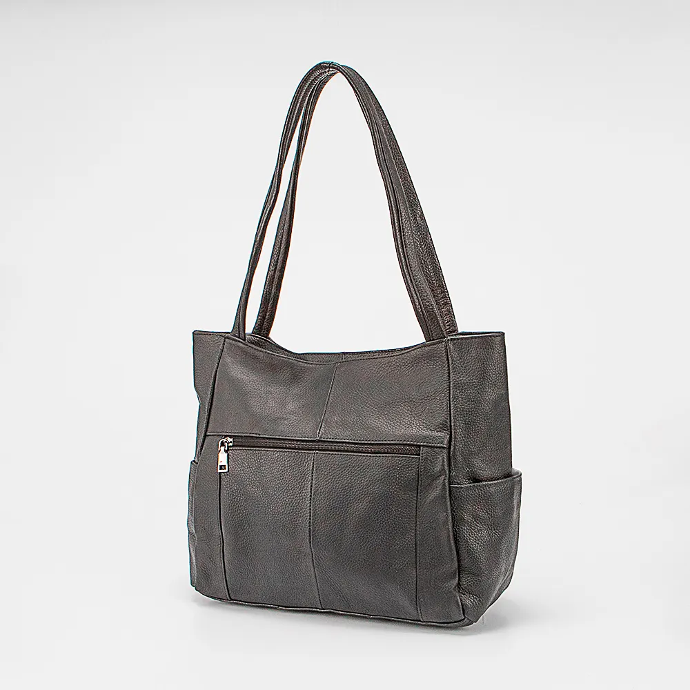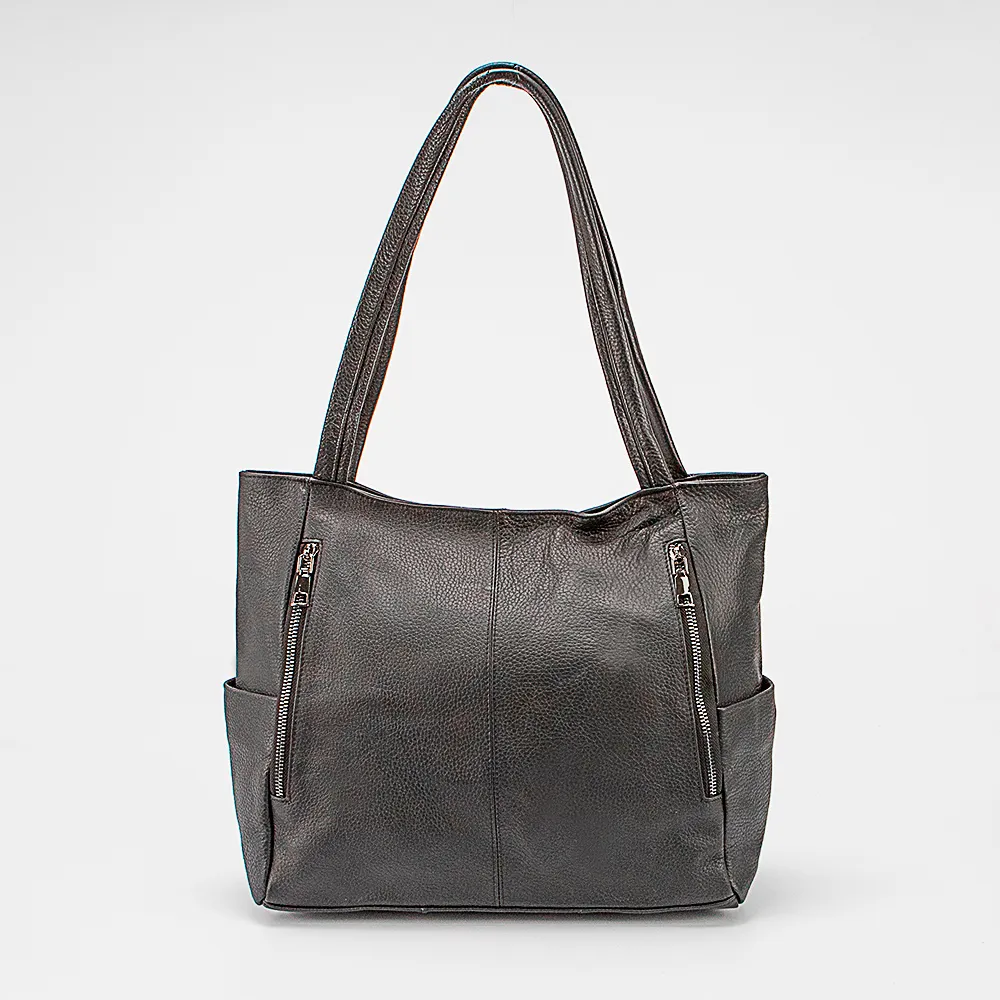 Сумка от торговой марки Poshete из натуральной кожи черного цвета. Модель с двумя удлиненными ручками. Отделение на молнии. Внутри: фирменная подкладка, карман на молнии, накладной карман, перегородка с карманом на молнии, образующая накладной карман. На лицевой стороне – два кармана на молнии. На задней стороне – карман на молнии. По бокам – накладной карман на магнитной кнопке.